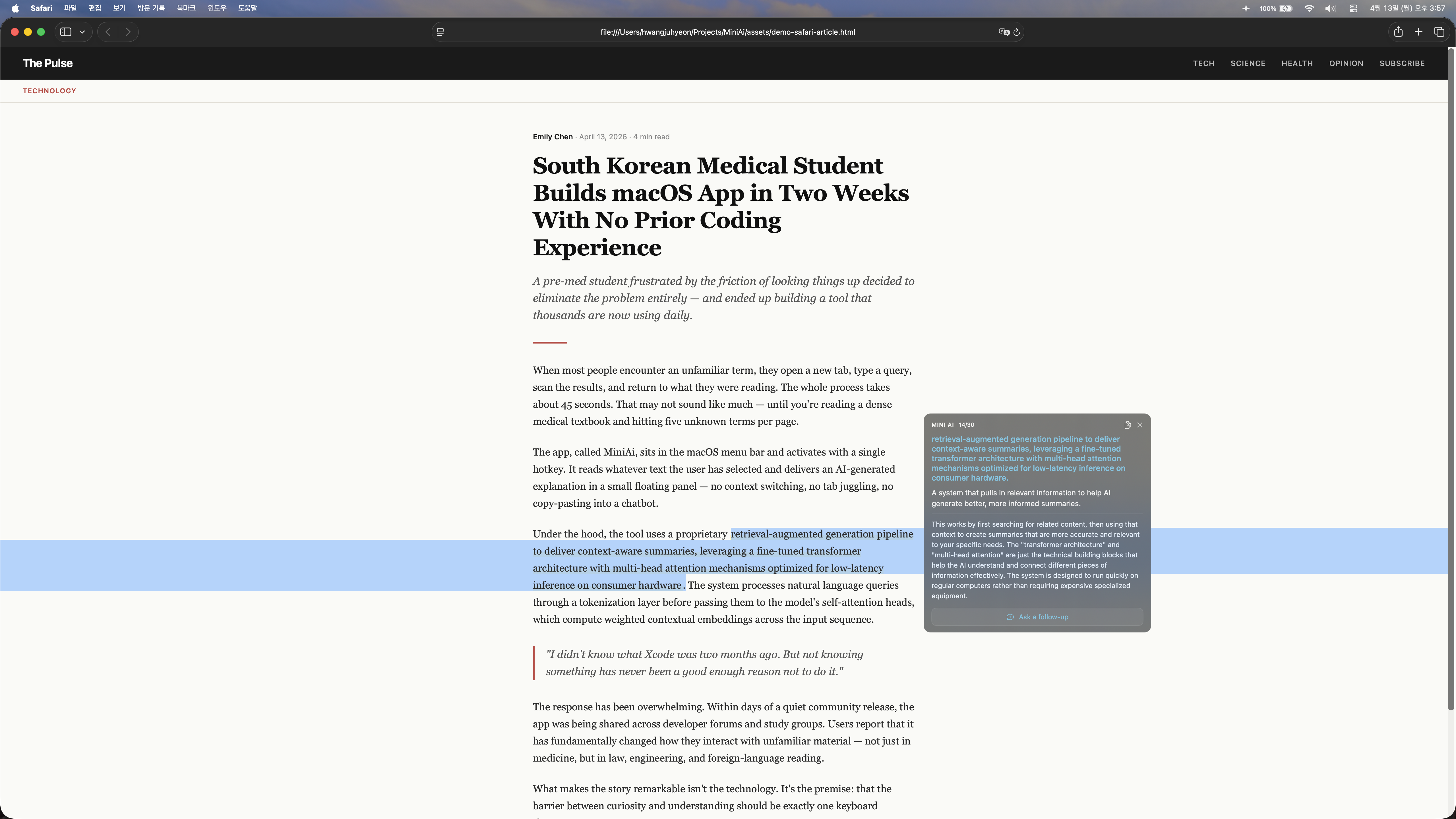 選取文字並按下 Option + Space 鍵,即可獲得 MiniAi 提供的 AI 解釋,這是一款提升效率的工具。