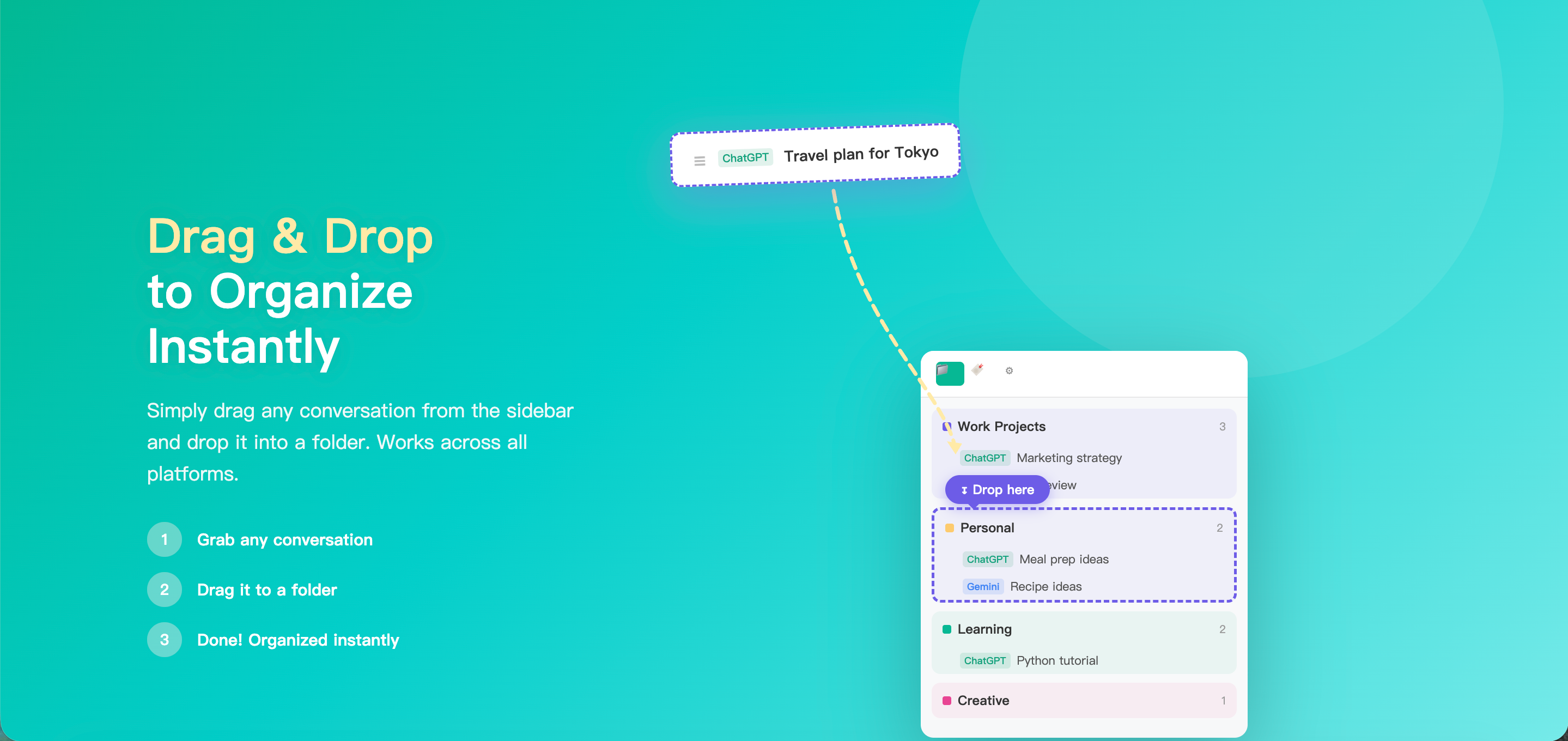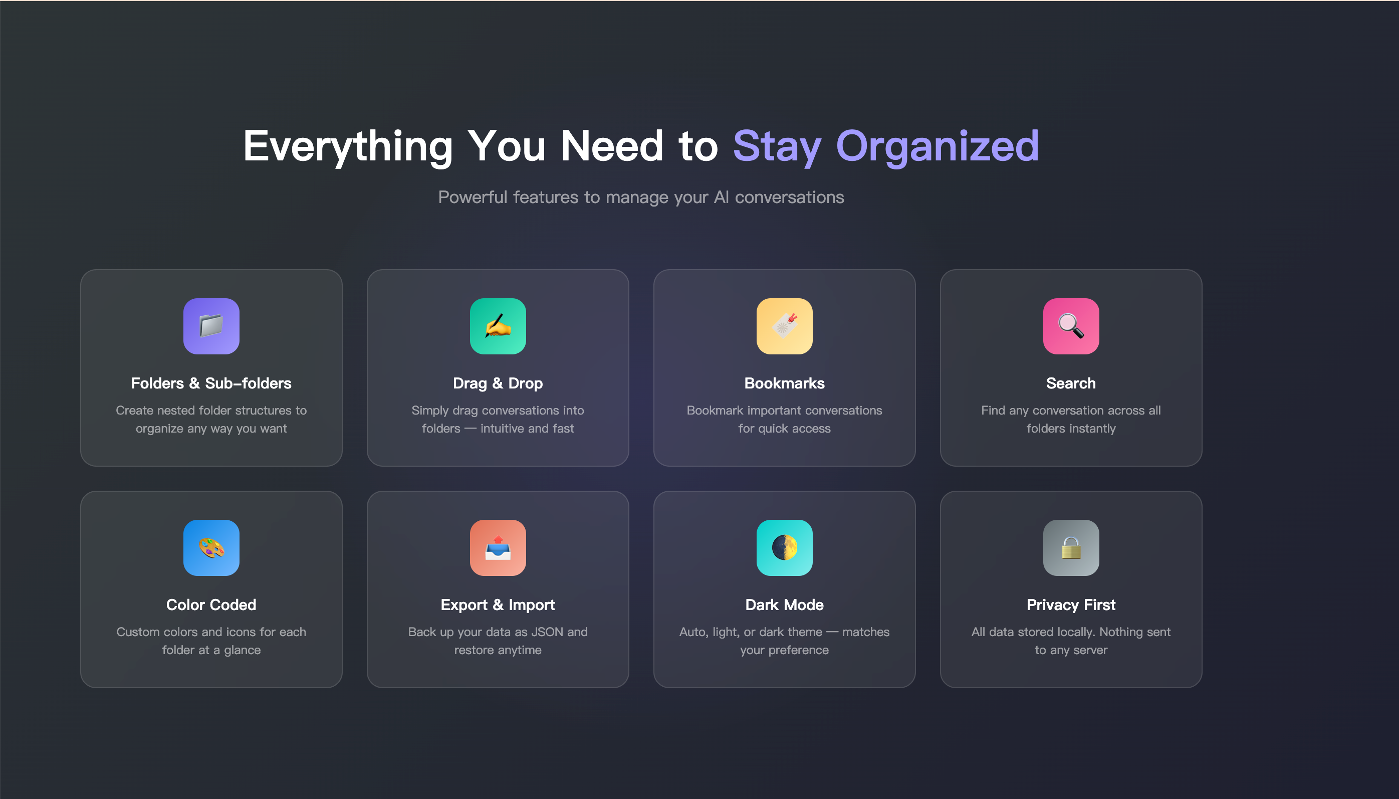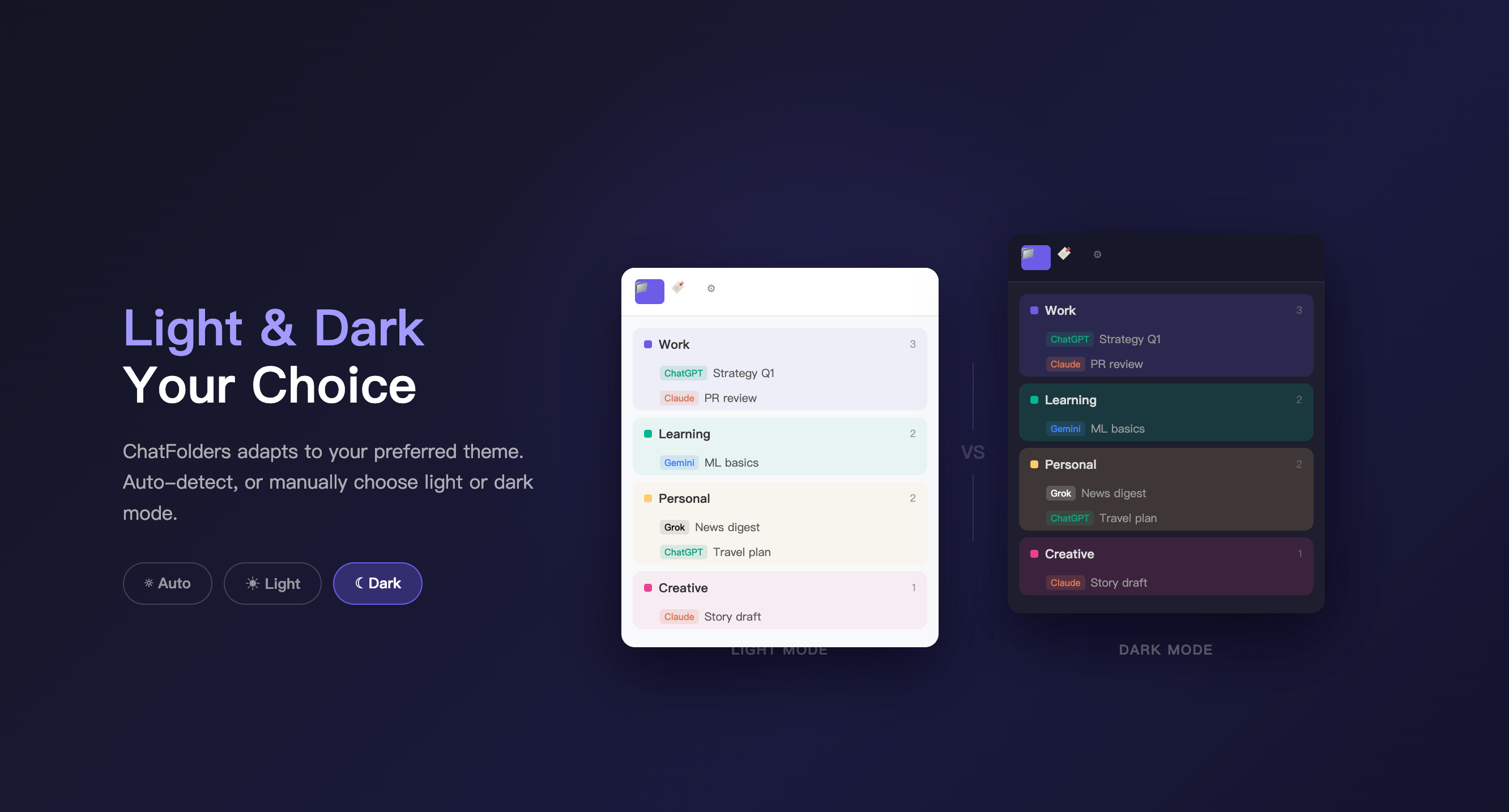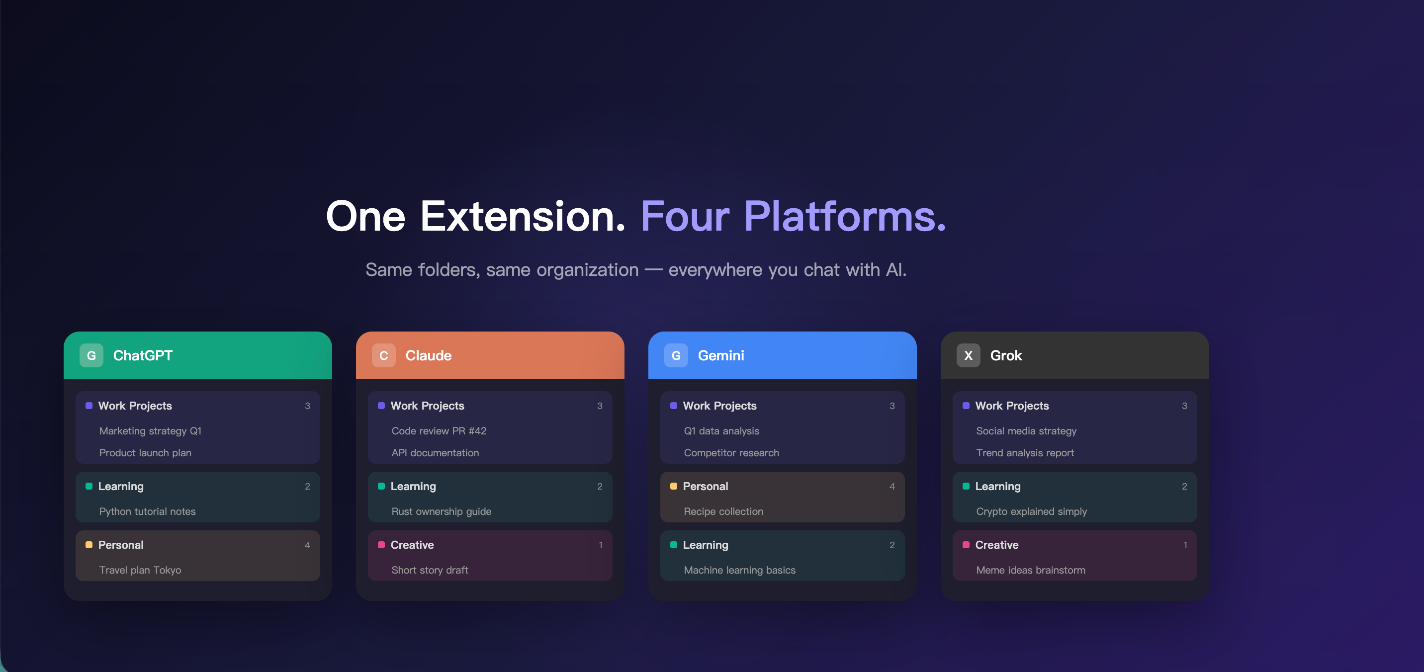 ChatFolders 是一款旨在為 ChatGPT、Claude、Gemini 及 Grok 等多個平台提供對話資料夾分類功能的生產力工具。
