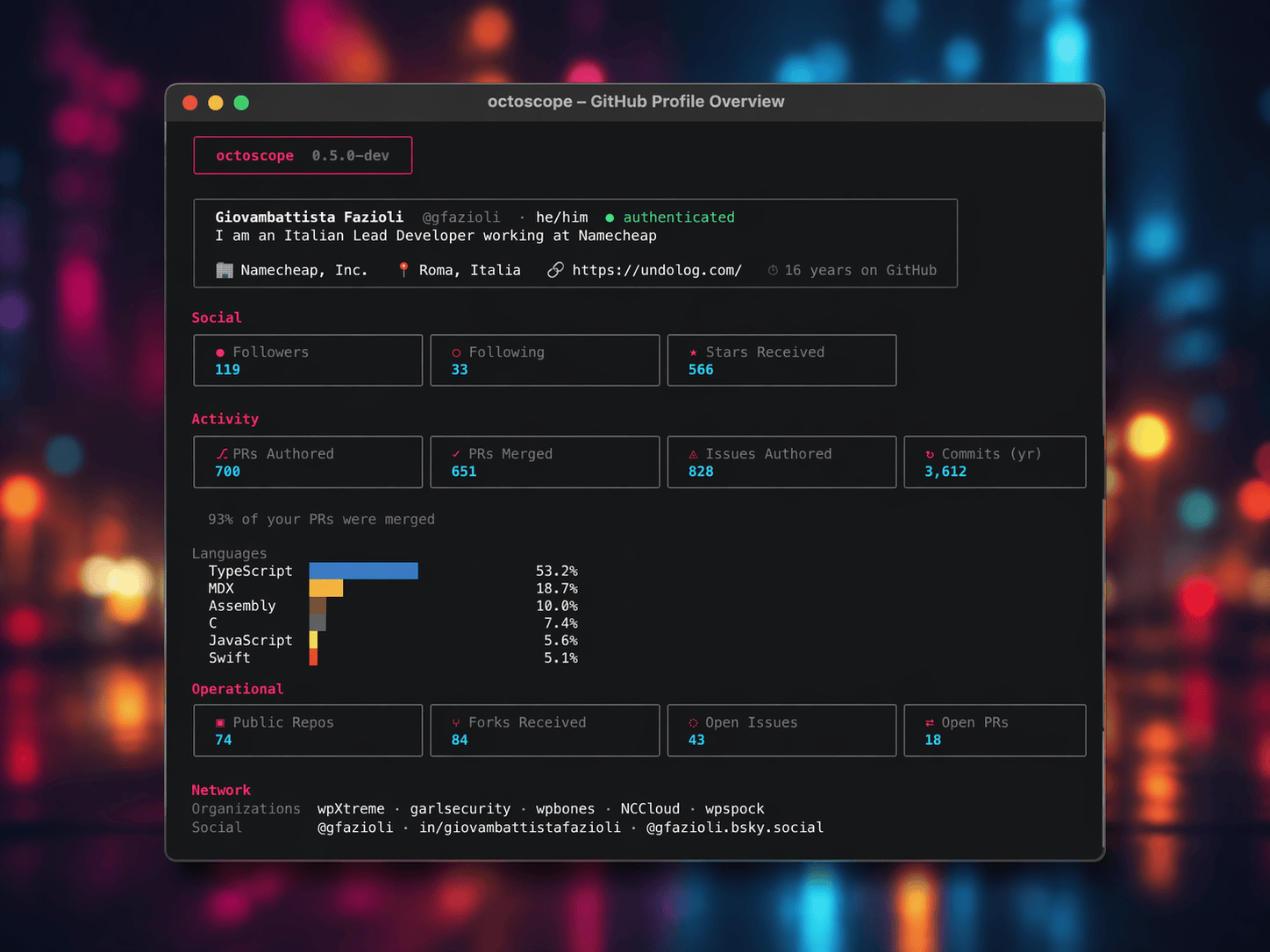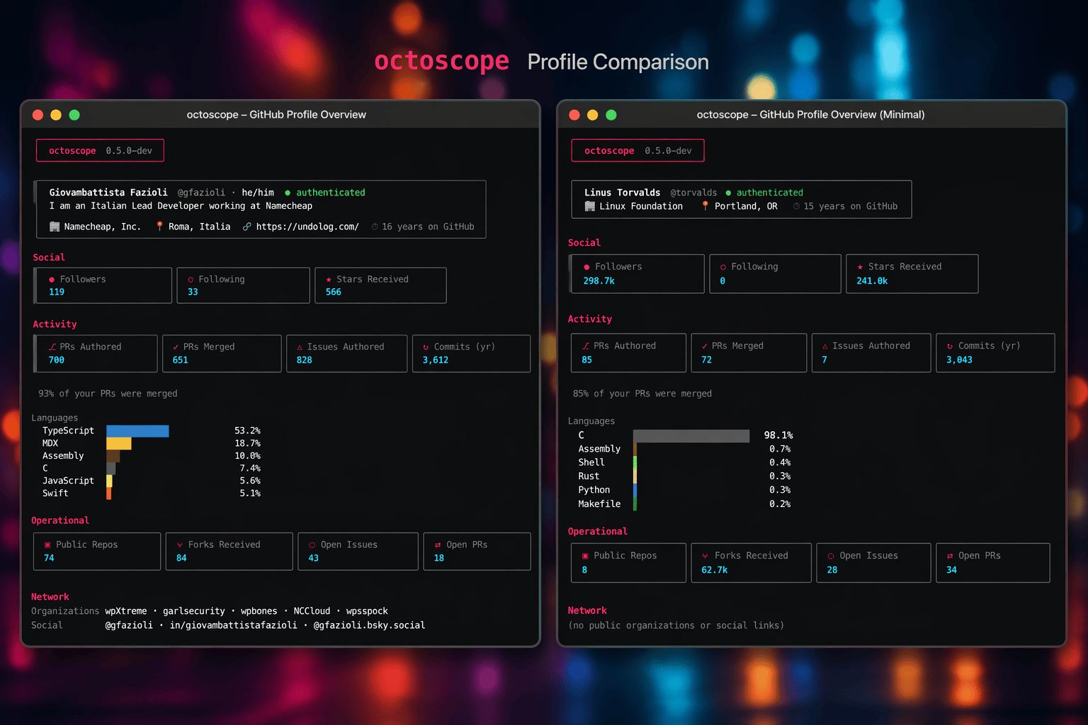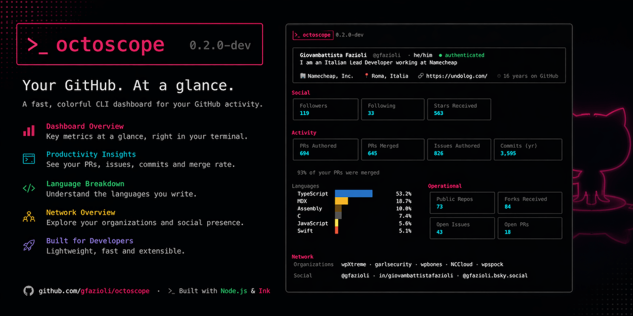 octoscope 是一款全新的開發者工具,能將你的 GitHub 個人檔案轉換為即時互動的終端風格儀表板,方便進行即時監控。