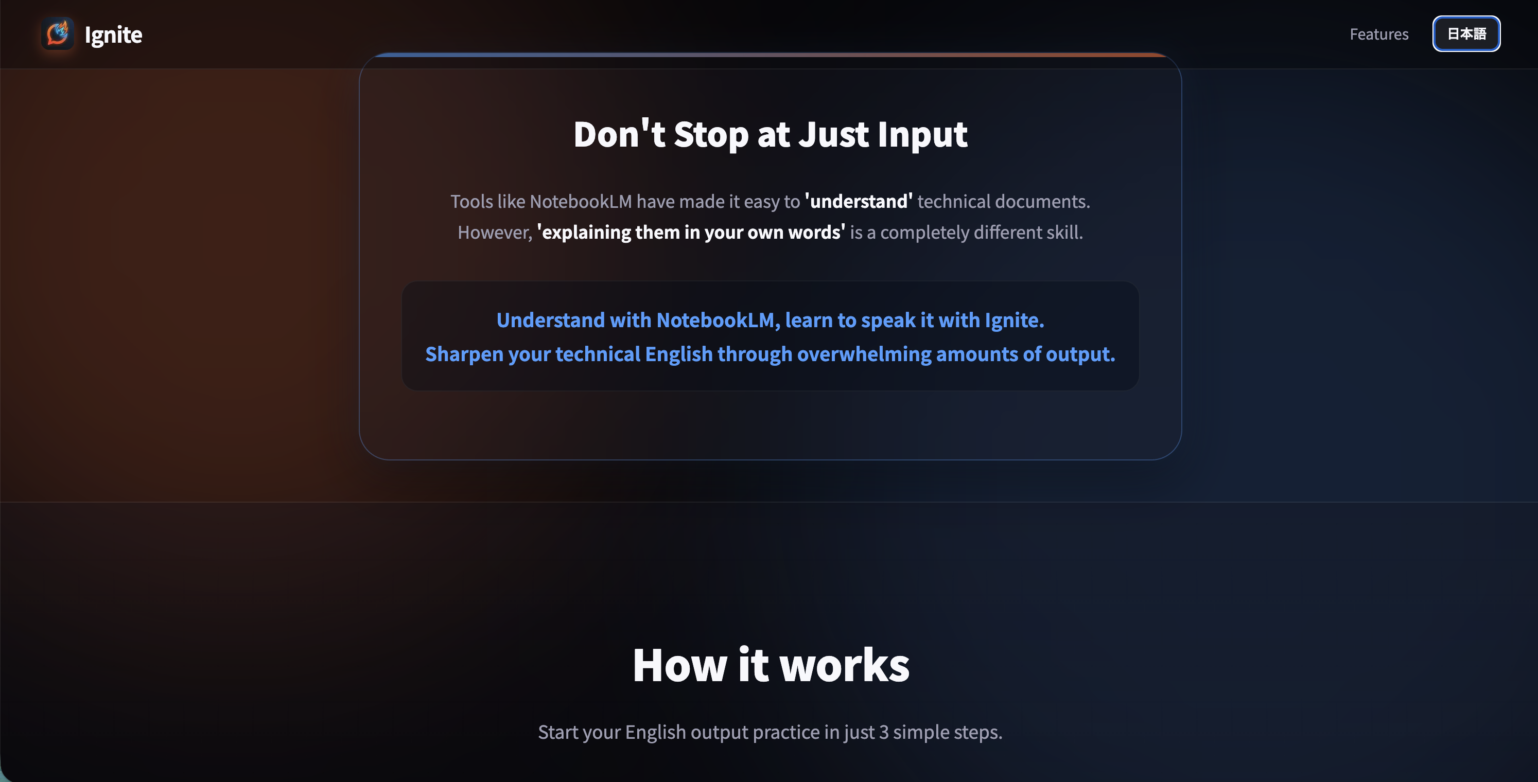 Ignite 是一款由 AI 驅動的工具,能將任何技術文件轉化為口說訓練,並透過 AI 進行評分,幫助你提升專業英語口說能力。