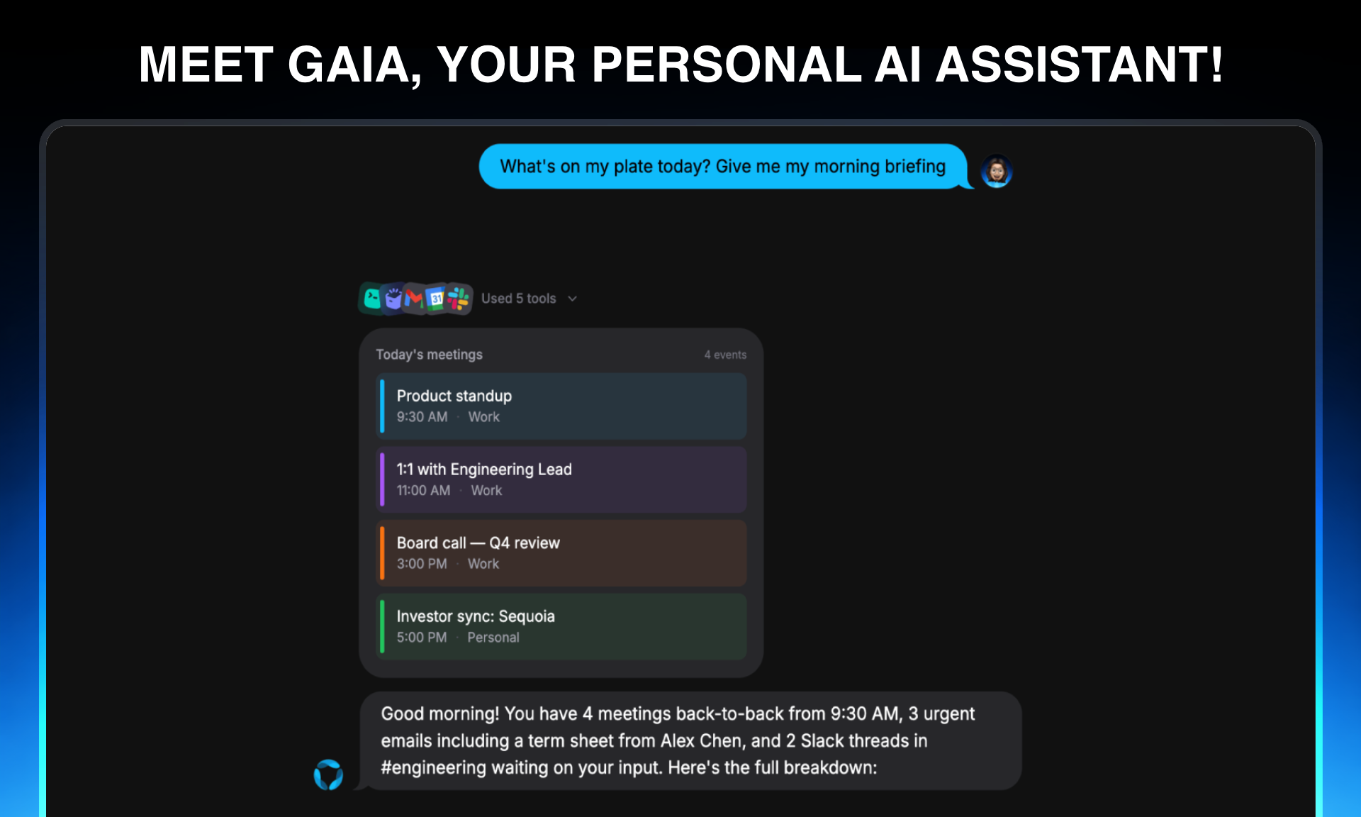GAIA 是您的個人 AI 助手,可用於處理電子郵件、日曆、任務及更多事務,幫助您提升工作效率。