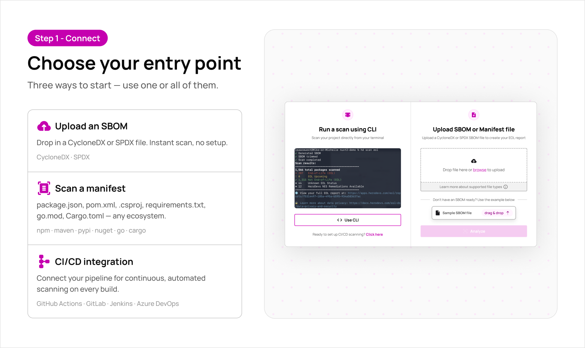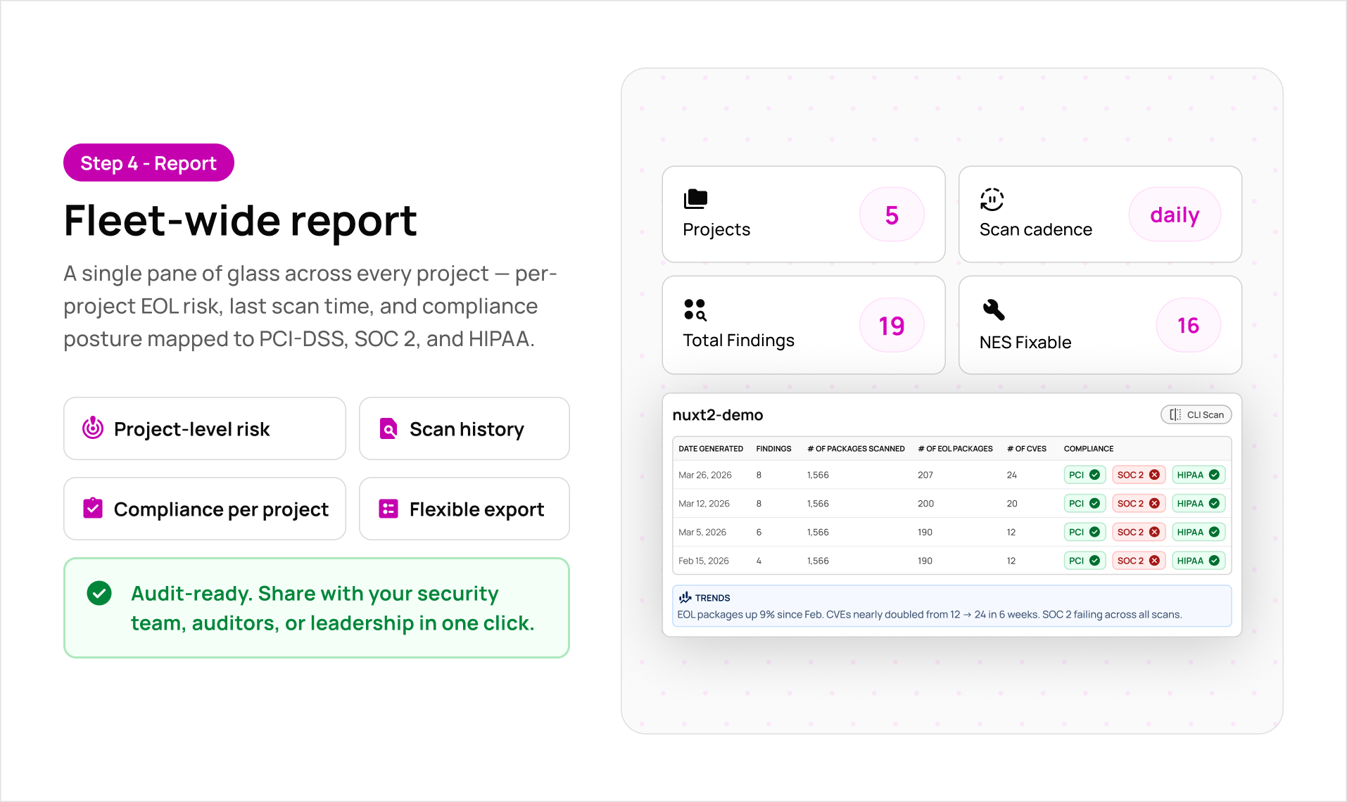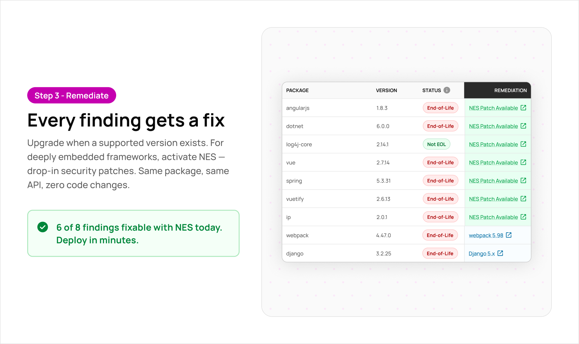 找出技術棧中所有的生命週期終止(EOL)依賴項。免費。5 分鐘搞定。