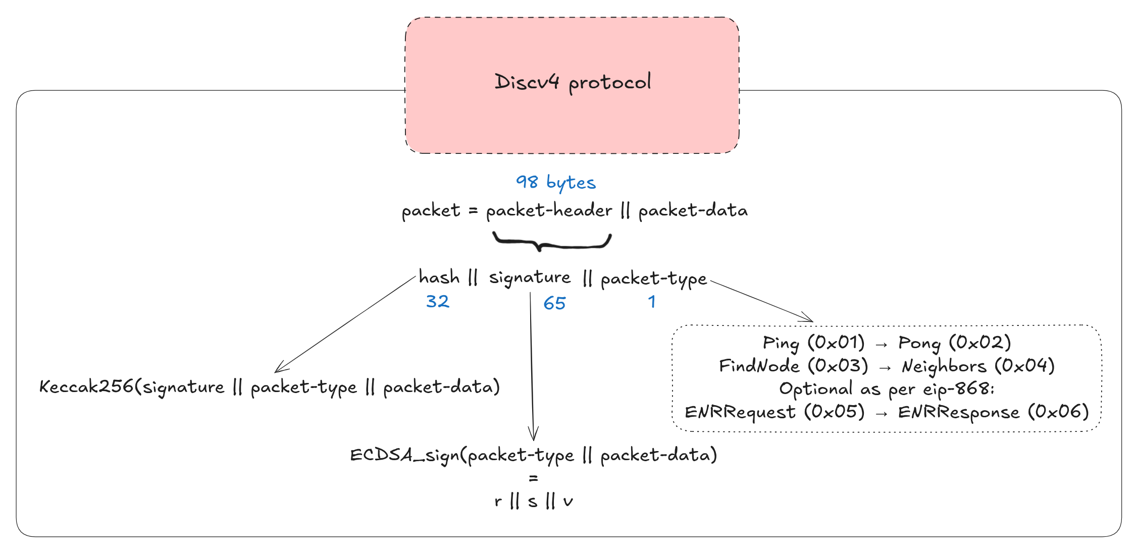我們專注於 Discv4,其原始設計使用 ECDSA 對每個 gossip 訊息進行簽章。以下顯示其封包結構: