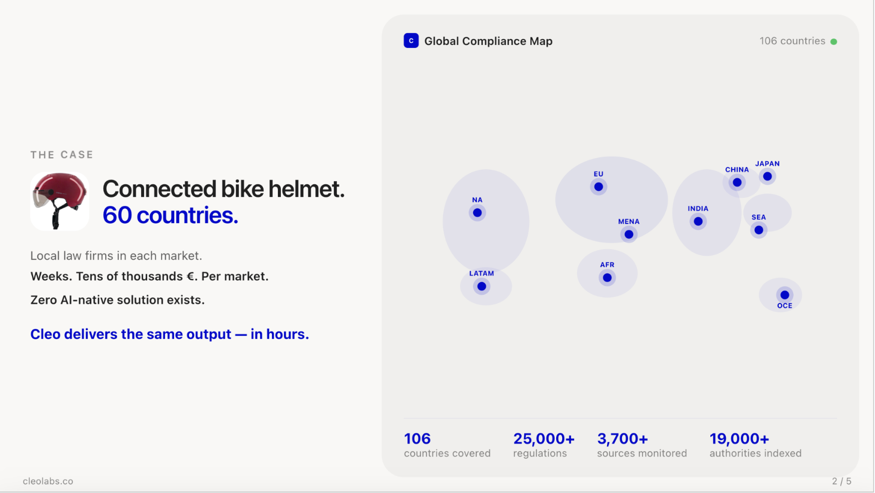 Cleo Labs 是一個自動化全球合規平台,旨在協助銷售實體產品的企業自動處理跨國市場的法規遵循流程。