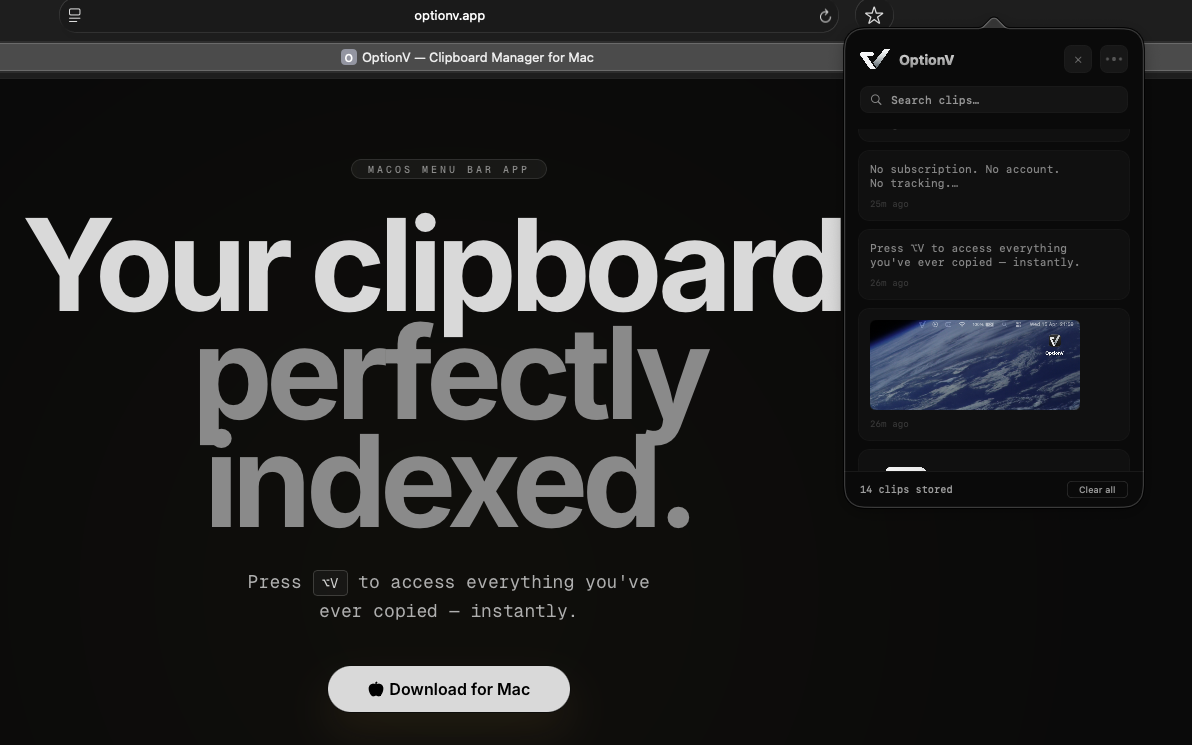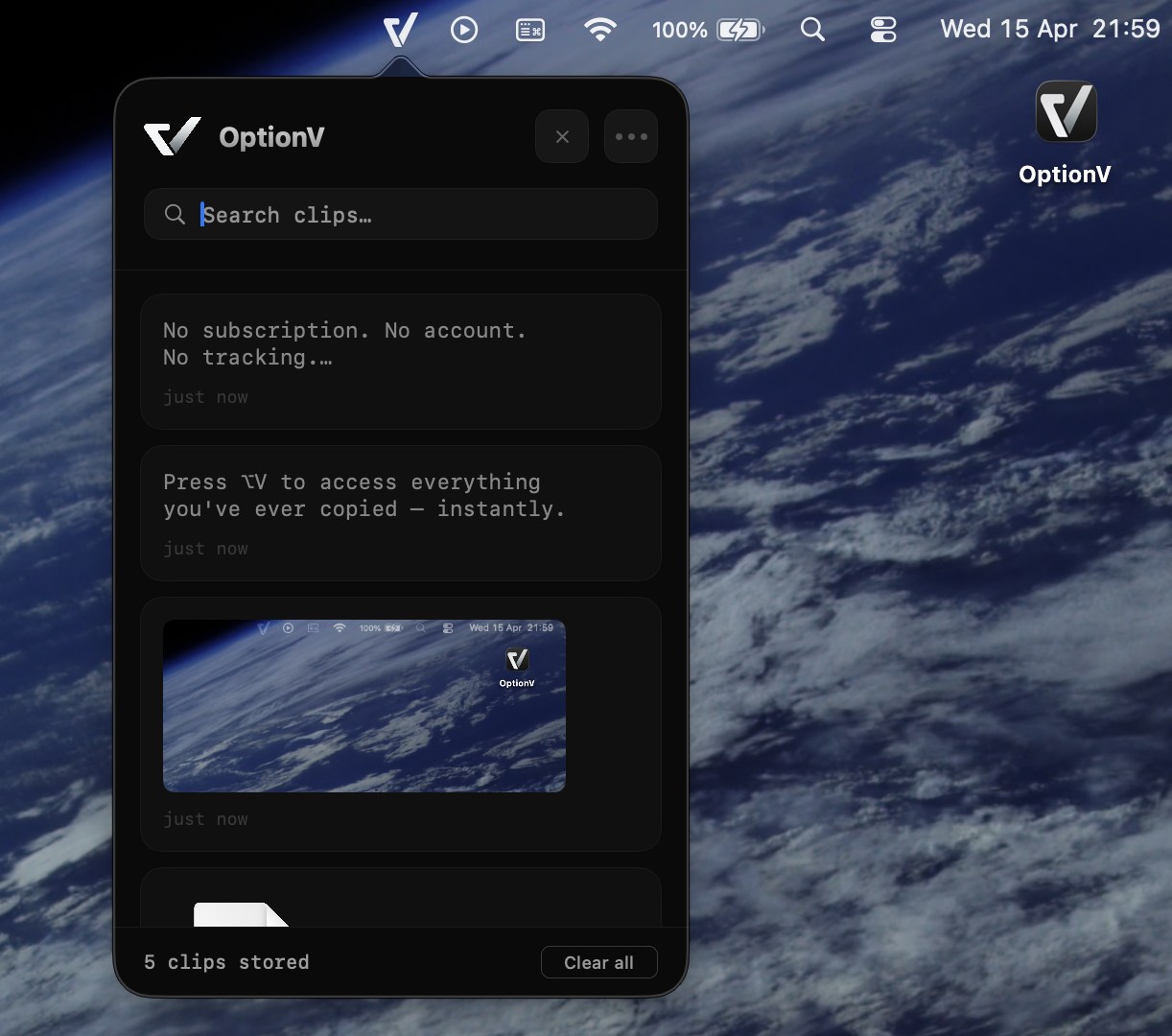 OptionV 是一款專為 MacOS 設計的生產力工具,常駐於選單列中,協助您高效管理剪貼簿歷史紀錄。