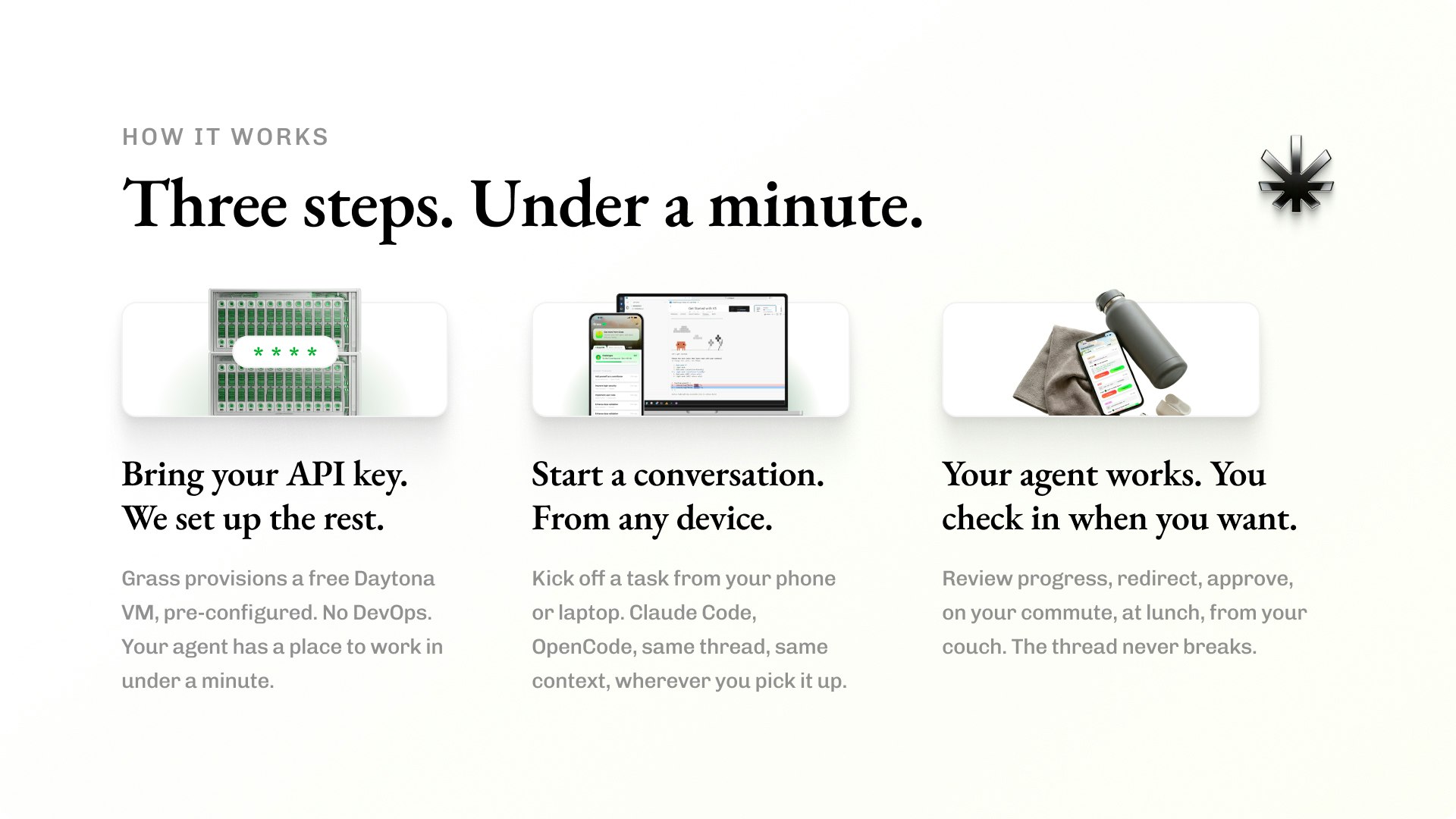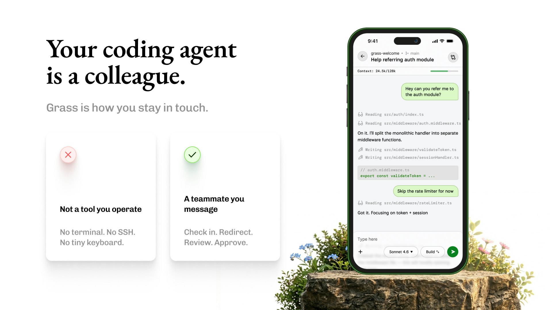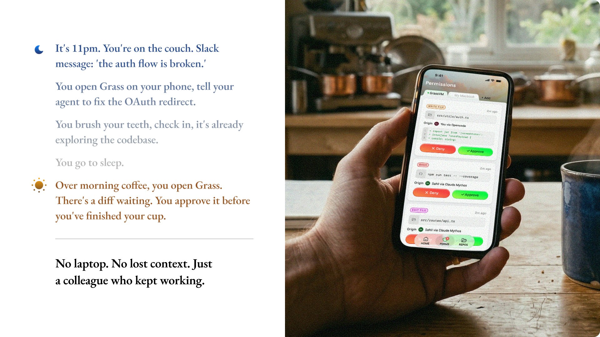Grass 為您的編碼代理提供全天候運行的雲端電腦,讓您隨時隨地都能查看工作進度。