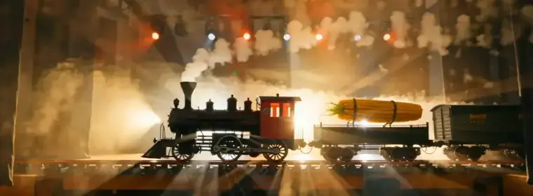 A train loaded with cargo traveling in the dark night, lights wrapping around and illuminating the train, tracks visible in the foreground, cinematic nighttime atmosphere, dynamic lighting effects, wide shot with dramatic perspective.