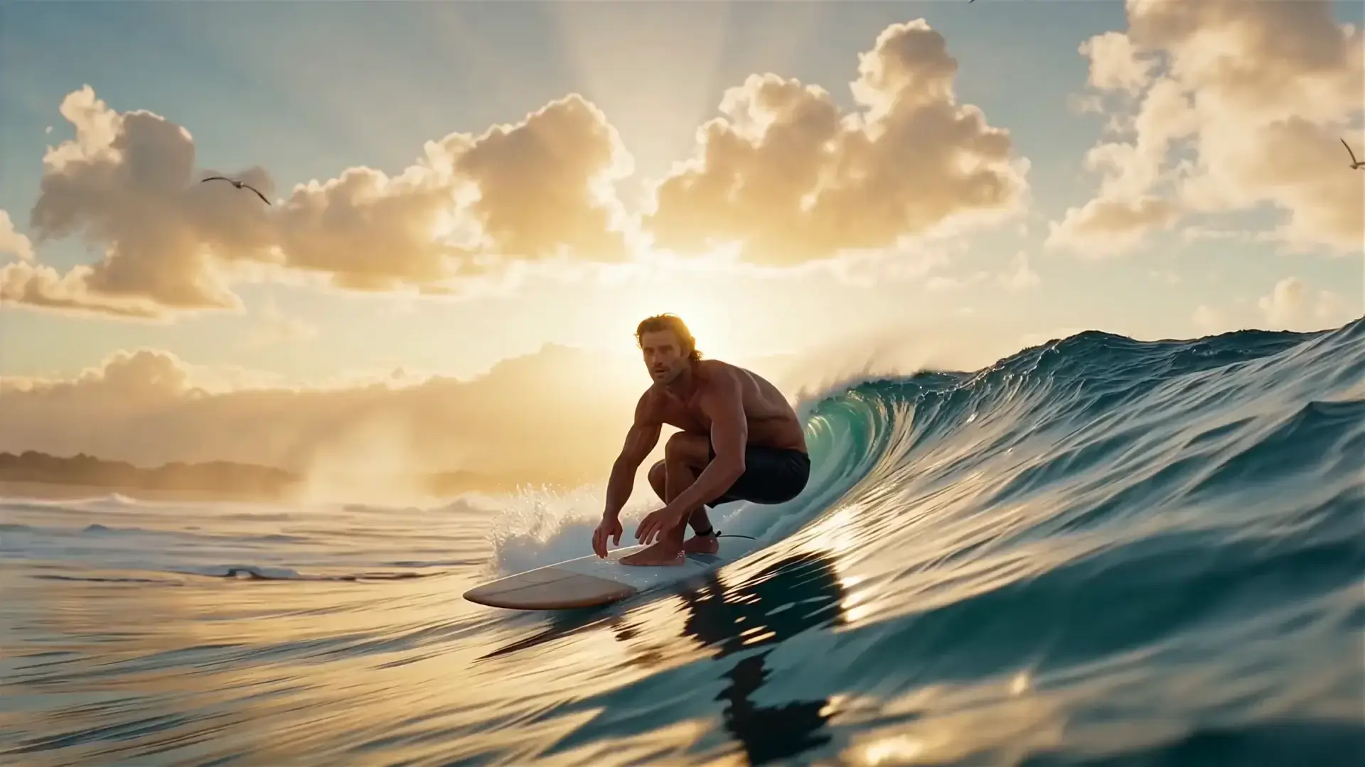 A man surfing in the ocean on a bright afternoon, displaying agile movements and skilled surfing techniques with dynamic action.