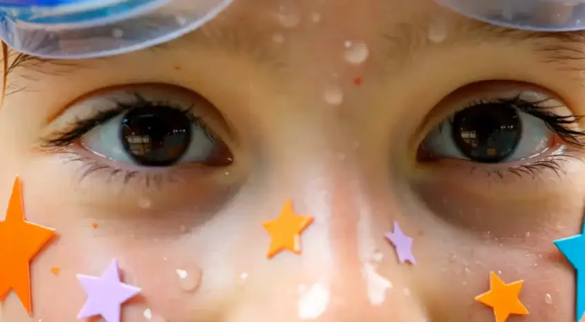 Extreme close-up of a girl's face with colorful star stickers, her eyes looking at the screen as she slowly puts on swimming goggles, water droplets on her face.
