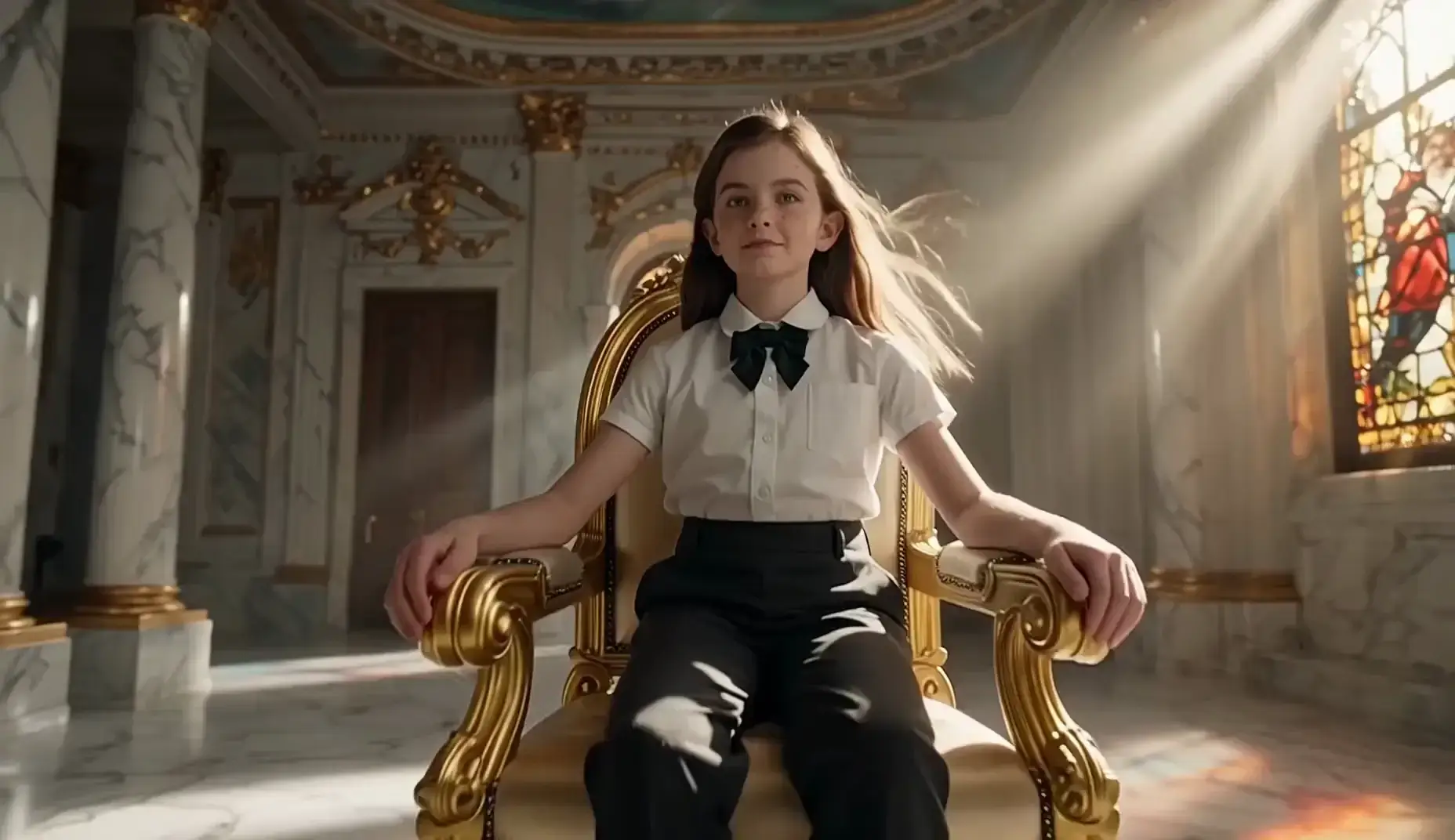 A girl sits solemnly on a throne in a castle, smiling as she raises her hand, while boys in suits below look up at her in attention.