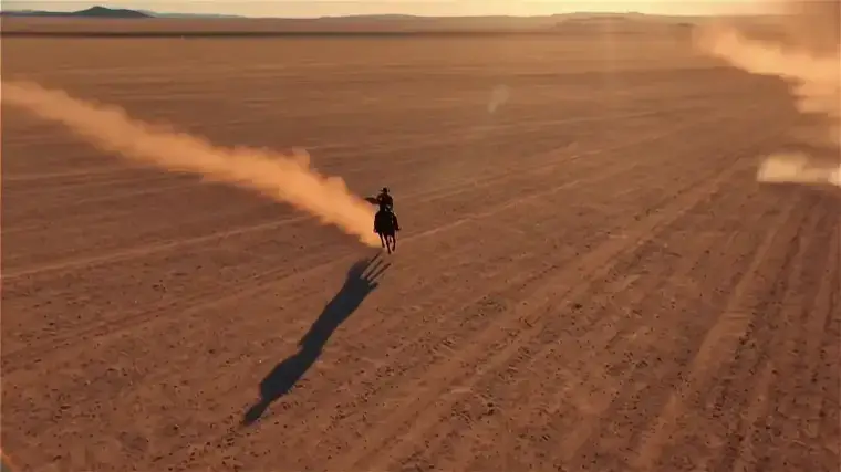 Cinematic western showdown: a cowboy on horseback pursues a train across the desert, exchanging gunfire with passengers, featuring dynamic rotating camera angles and a dramatic finale on a bridge.