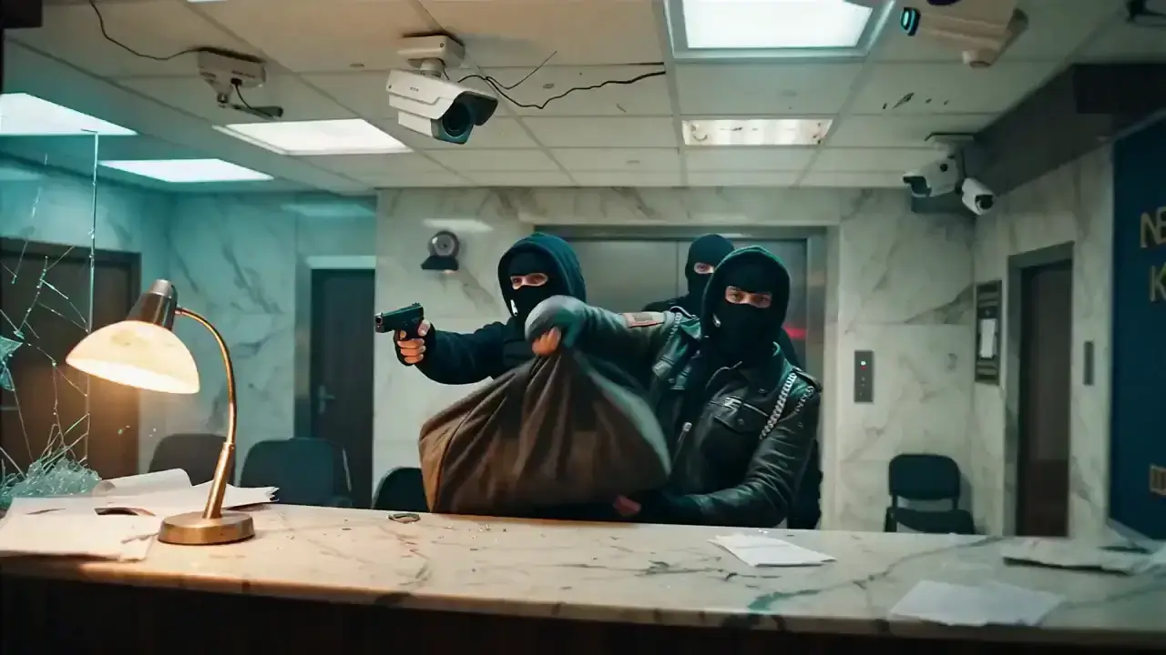 Tense bank robbery scene: masked robbers in a surveillance-filled bank carrying bags of money, guns drawn as they survey the surroundings, featuring a close-up on one of the criminals.