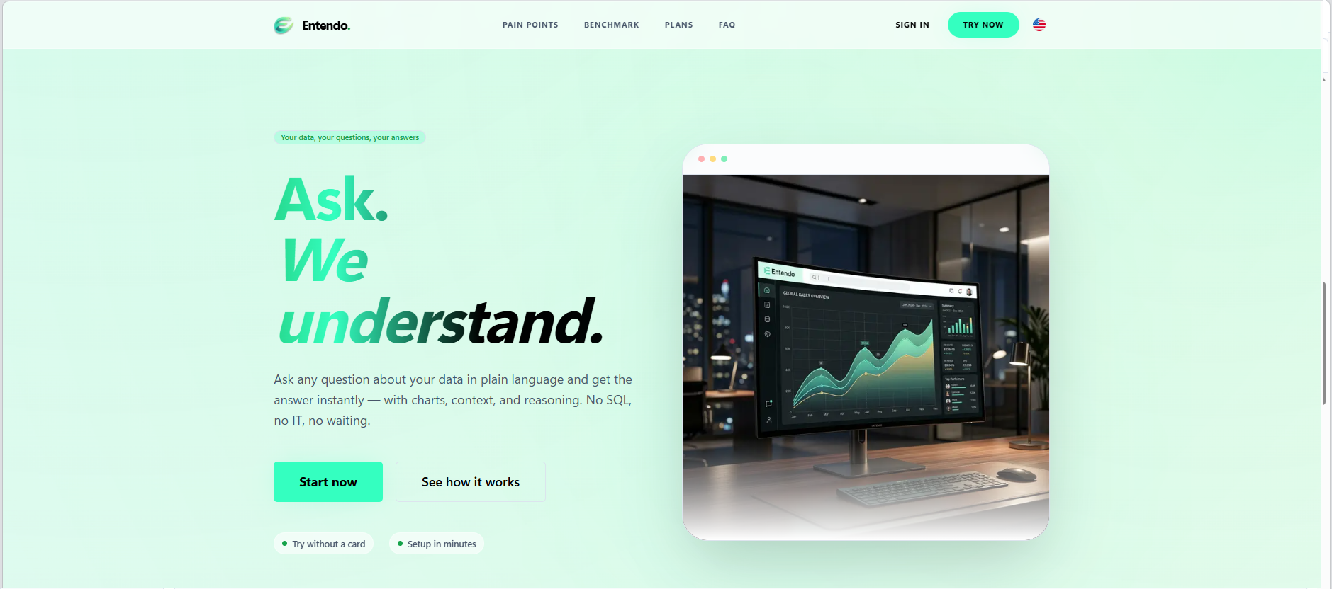 Entendo 是一款人工智慧驅動的工具,讓使用者只需透過自然語言提問,就能生成即時圖表與數據分析。