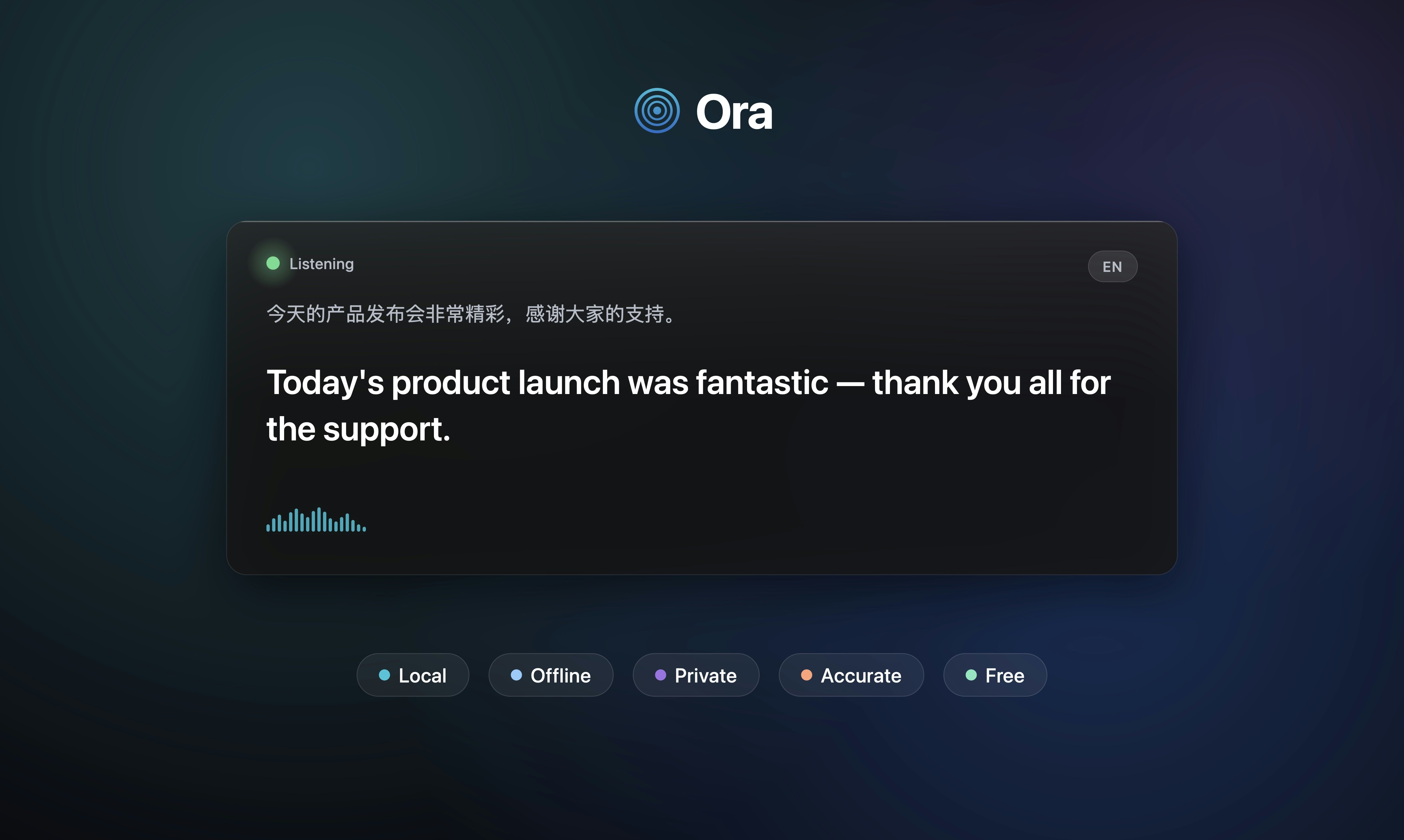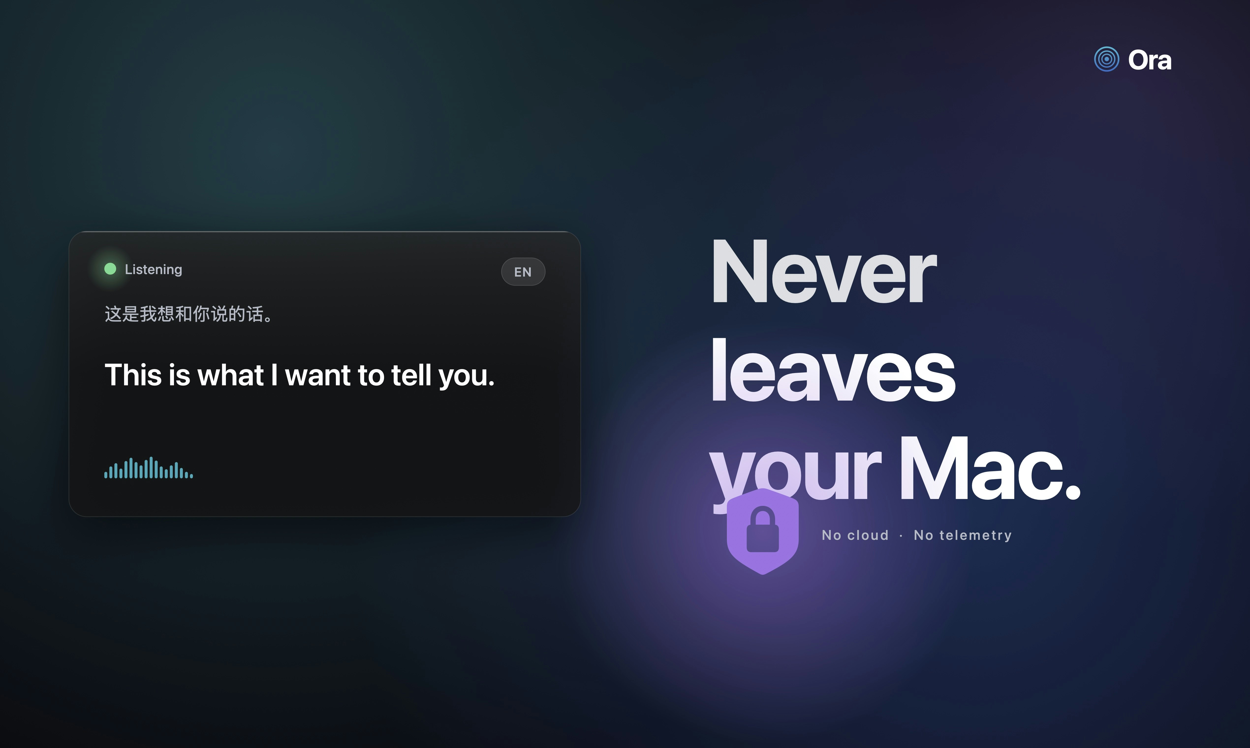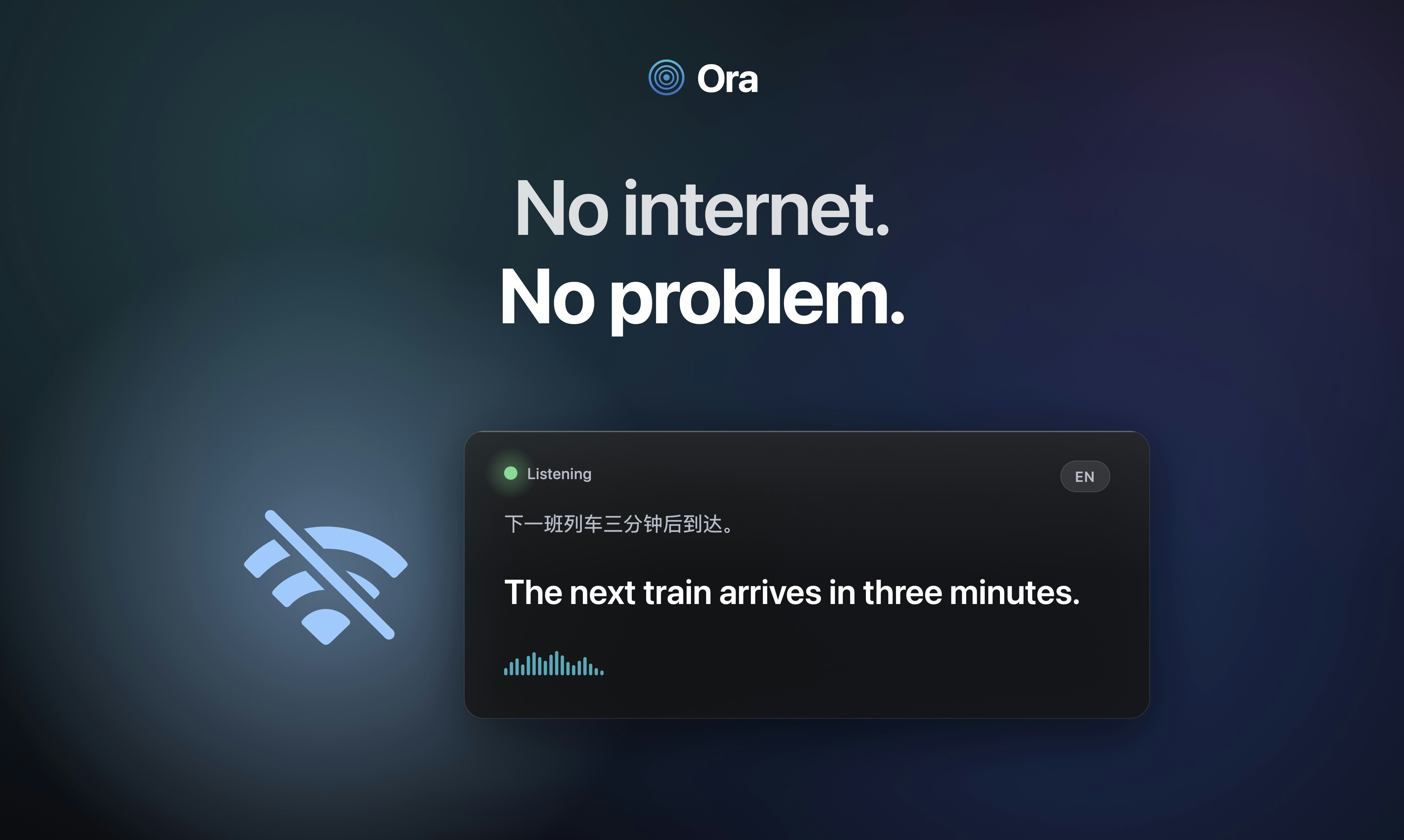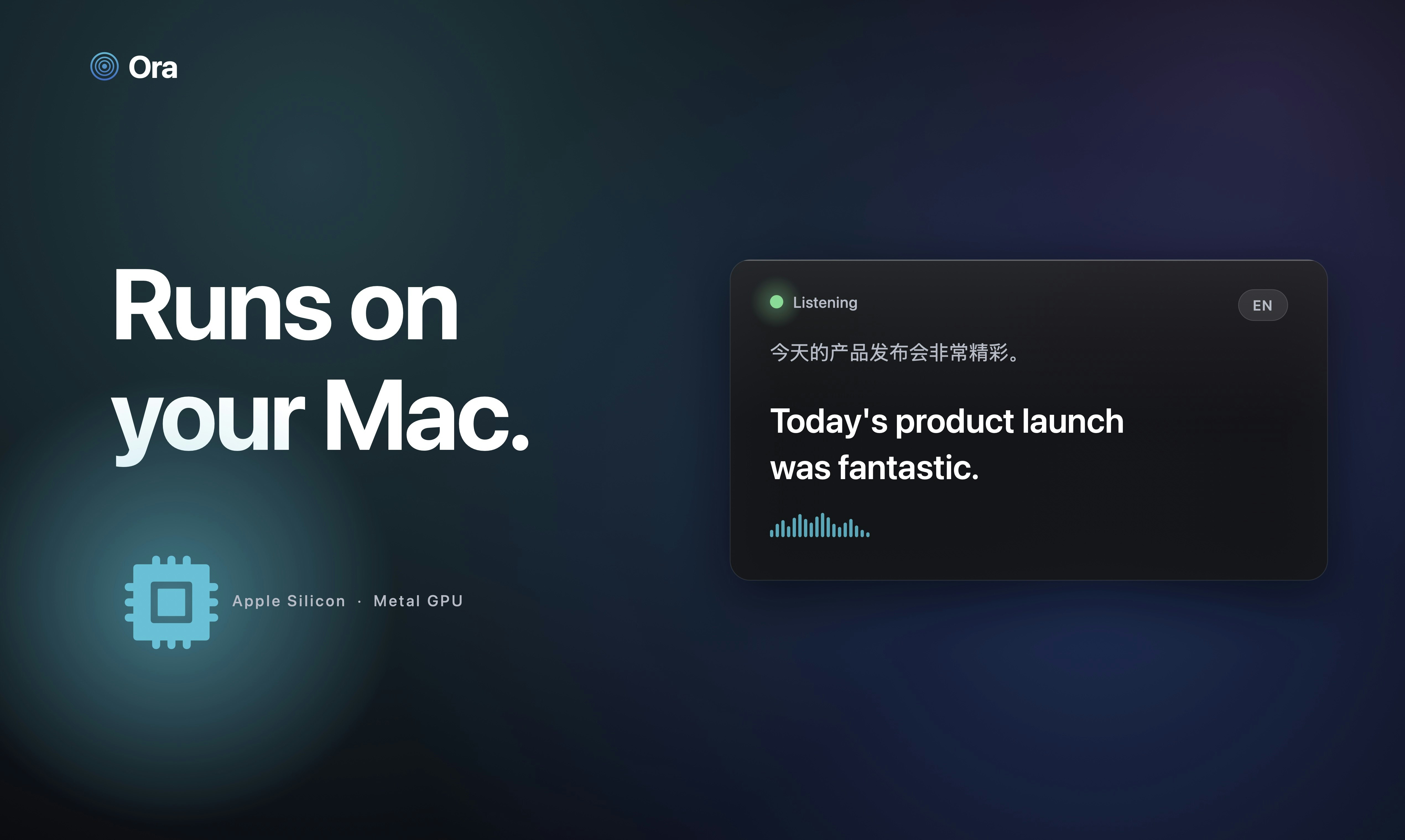 ora 是一款專為 Mac 設計的個人專屬同步口譯員,能為您提供即時的翻譯與溝通服務。