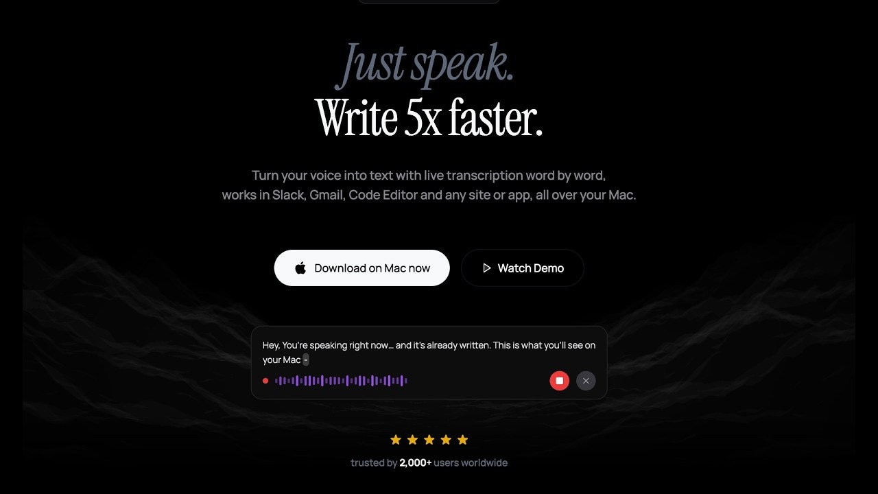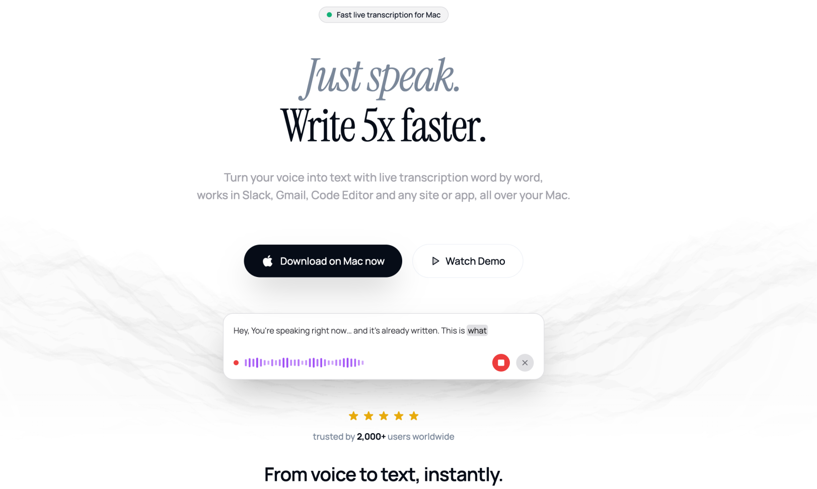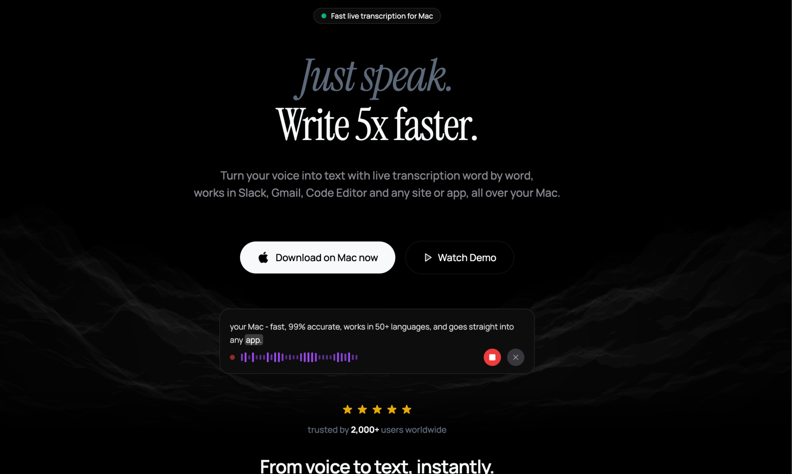 TalkFlowy 是一款 Mac 應用程式,提供本地即時語音轉錄功能,幫助您以快五倍的速度進行寫作,且永遠不需要訂閱費用。