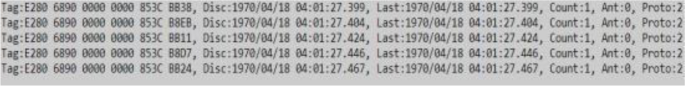 We can modify the data provided by the RFID reader and connected antennas. The reader provided by Alien allows us to receive a list of tags in different formats. We can choose an XML format with basic information or a modifiable sequence of characters and variables for each tag. Thanks to the reader, we can receive information such as an identification number, the tag discovery time, the tag's last seen moment, the statistic of readings since the last transmission of data, the antenna that discovered the tag, and the power with which the tag is read, among other details [10] (Fig. 10).