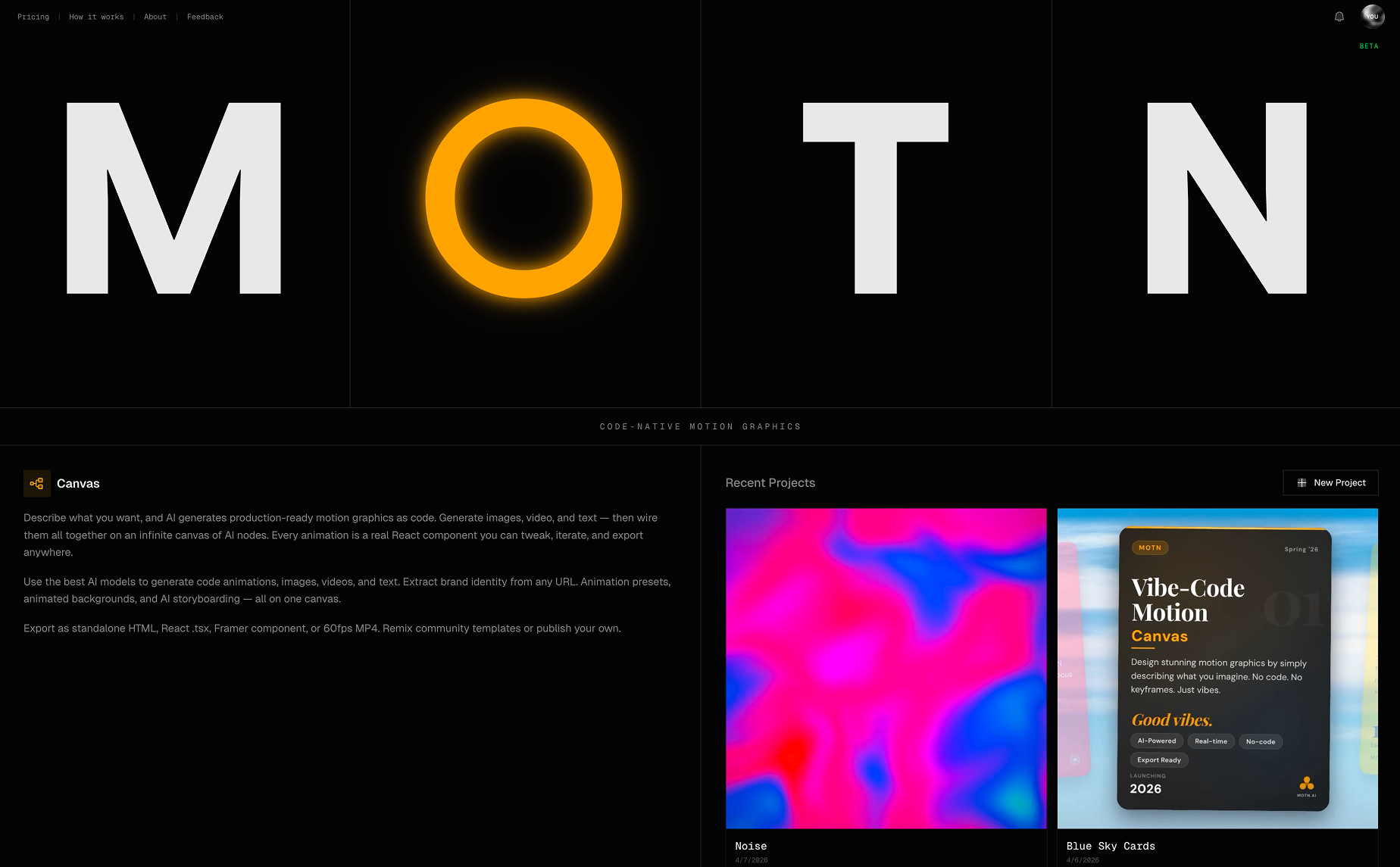 Motn AI 是一款創意工具,讓使用者能在單一畫布上透過 vibe-code 方式生成並編輯動態圖形。