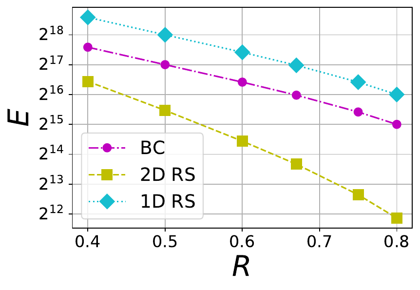 圖 3 顯示了不同 \mu 值的 BC 碼在 S 和 R 之間的權衡。圖中還包含了 1D 和 2D RS 碼的權衡。因此,BC 碼實現了介於 1D 和 2D RS 碼之間的區域。