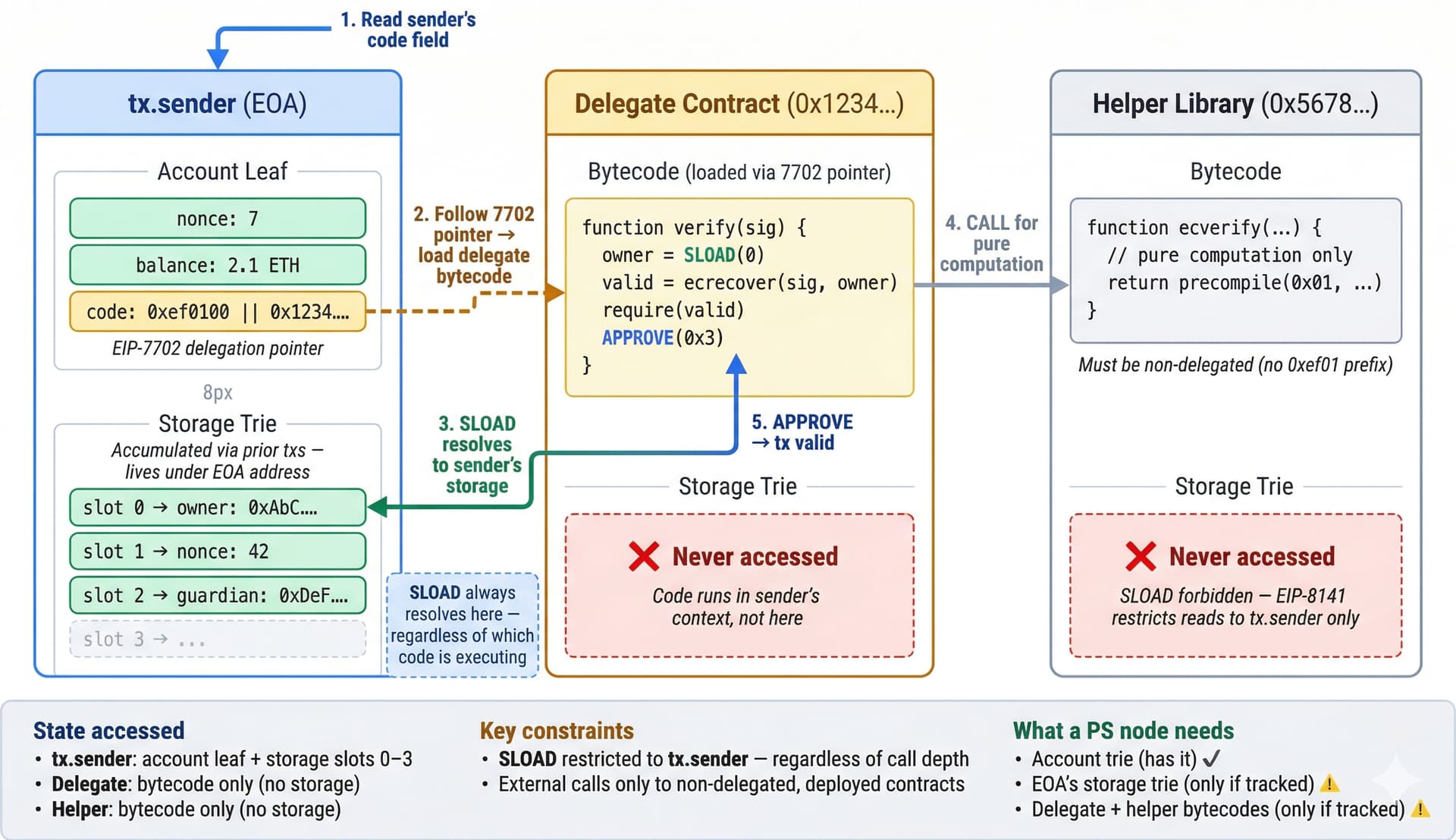 另外兩個約束塑造了狀態訪問。首先,EIP-8141 的規則「SLOAD 限制於 tx.sender 存儲」與 7702 並非重複——它約束了傳遞調用(transitive calls)。如果委託代碼透過 CALL 調用輔助庫,該輔助庫會進入其自身的執行上下文,此時 SLOAD 通常會讀取輔助庫的存儲。EIP-8141 規則禁止這樣做:透過 CALL 到達的輔助庫只能執行純計算(簽名數學、哈希、預編譯調用)。如果委託代碼改用 DELEGATECALL,執行上下文仍保持為發送者的——SLOAD 依然讀取發送者的存儲,這是被允許的。其次,在 VERIFY 期間調用其他 7702 委託帳戶是被明確禁止的——它們的委託目標是可變的,因此一筆 SetCode 交易可能會使所有依賴於該帳戶當前行為的待處理 Frame 交易失效。