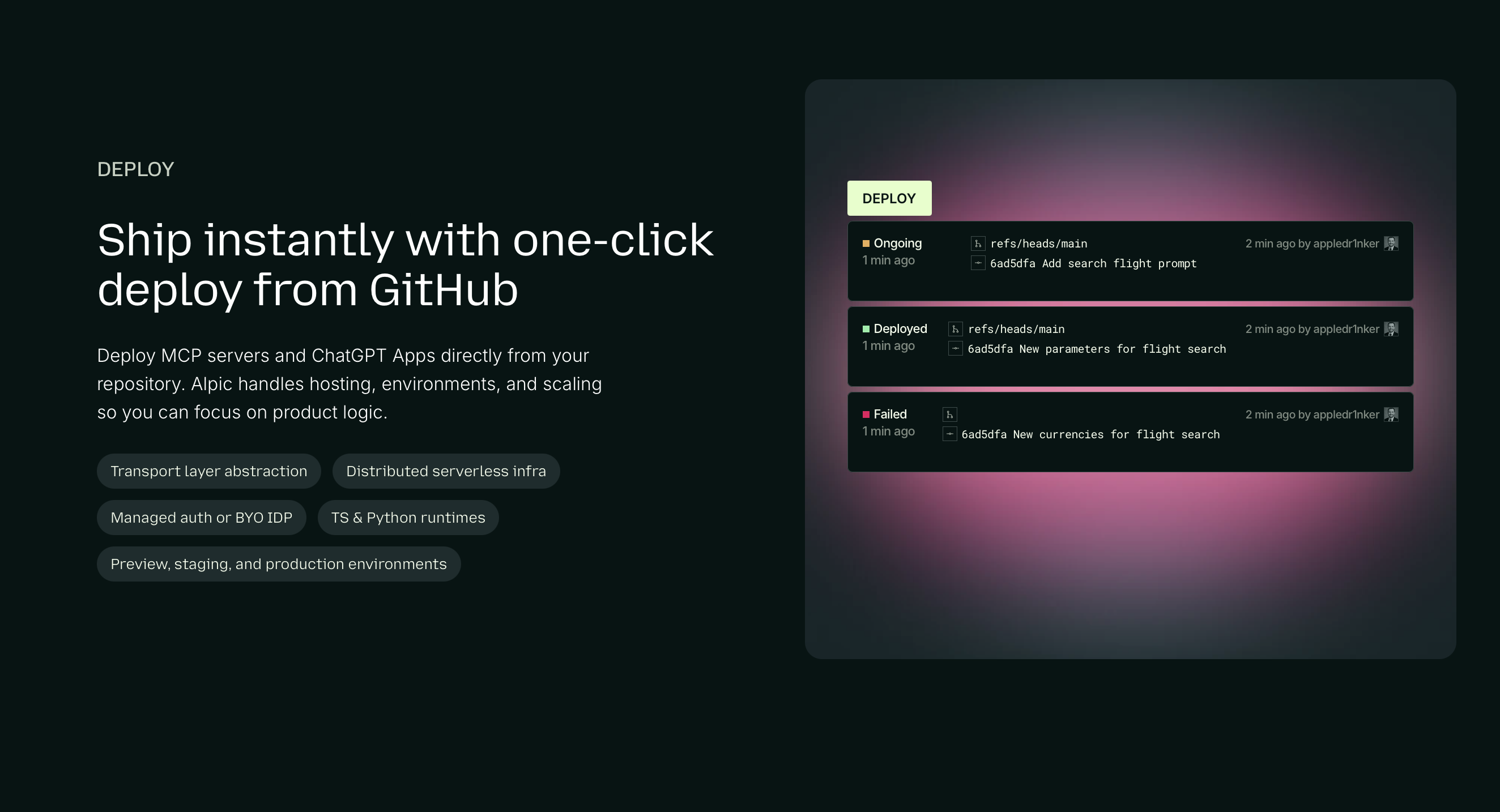 Alpic 是一個旨在幫助開發者高效構建、發佈並分發 AI 應用程式與模型上下文協定 (MCP) 伺服器的平台。