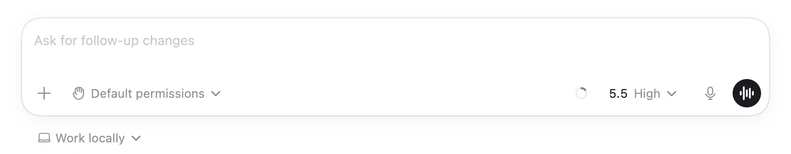 如果您在專案中工作,您可能會在輸入框下方看到「本地工作」(Work locally)字樣。這意味著「Codex 只能在我指定的資料夾中工作,並使用我選擇的工具」。您還會看到一個下拉選單,詢問您是否要更改權限。當您剛開始使用 Codex 時,我們建議在本地環境中堅持使用「預設權限」。Codex 不會自動獲得存取您電腦上所有內容的權限。