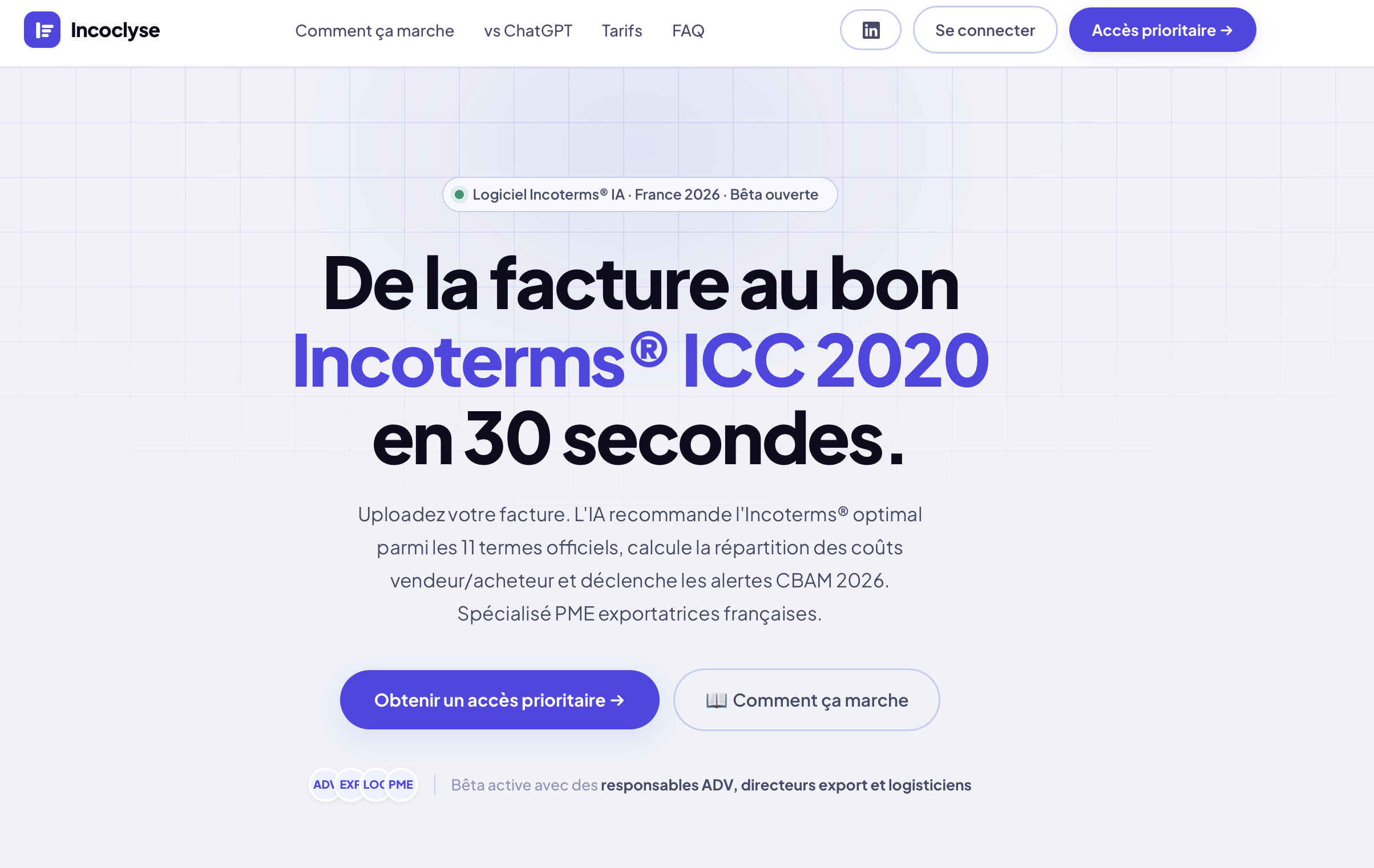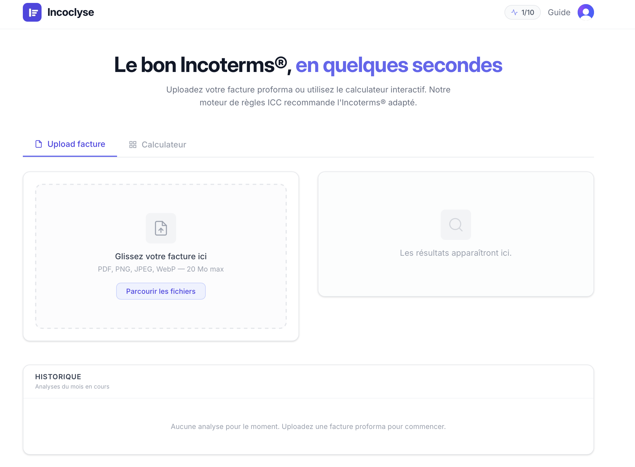 Incoclyse 是一款人工智慧驅動的解決方案,旨在分析您的發票並自動為國際貿易合規性挑選正確的國際貿易術語(Incoterms)。
