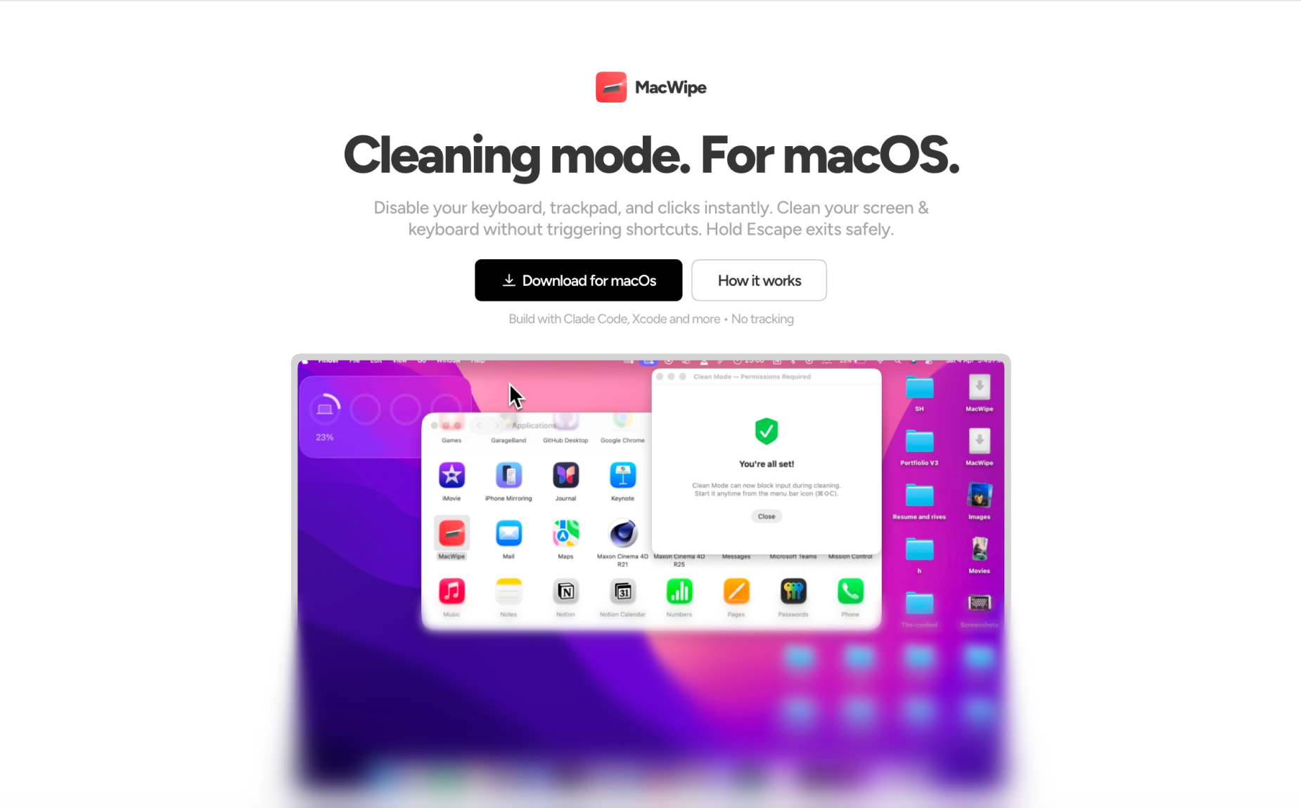 MacWipe 是一款適用於 macOS 的工具程式,能讓您透過暫時停用鍵盤與觸控板來安全地清潔螢幕,避免產生誤觸。