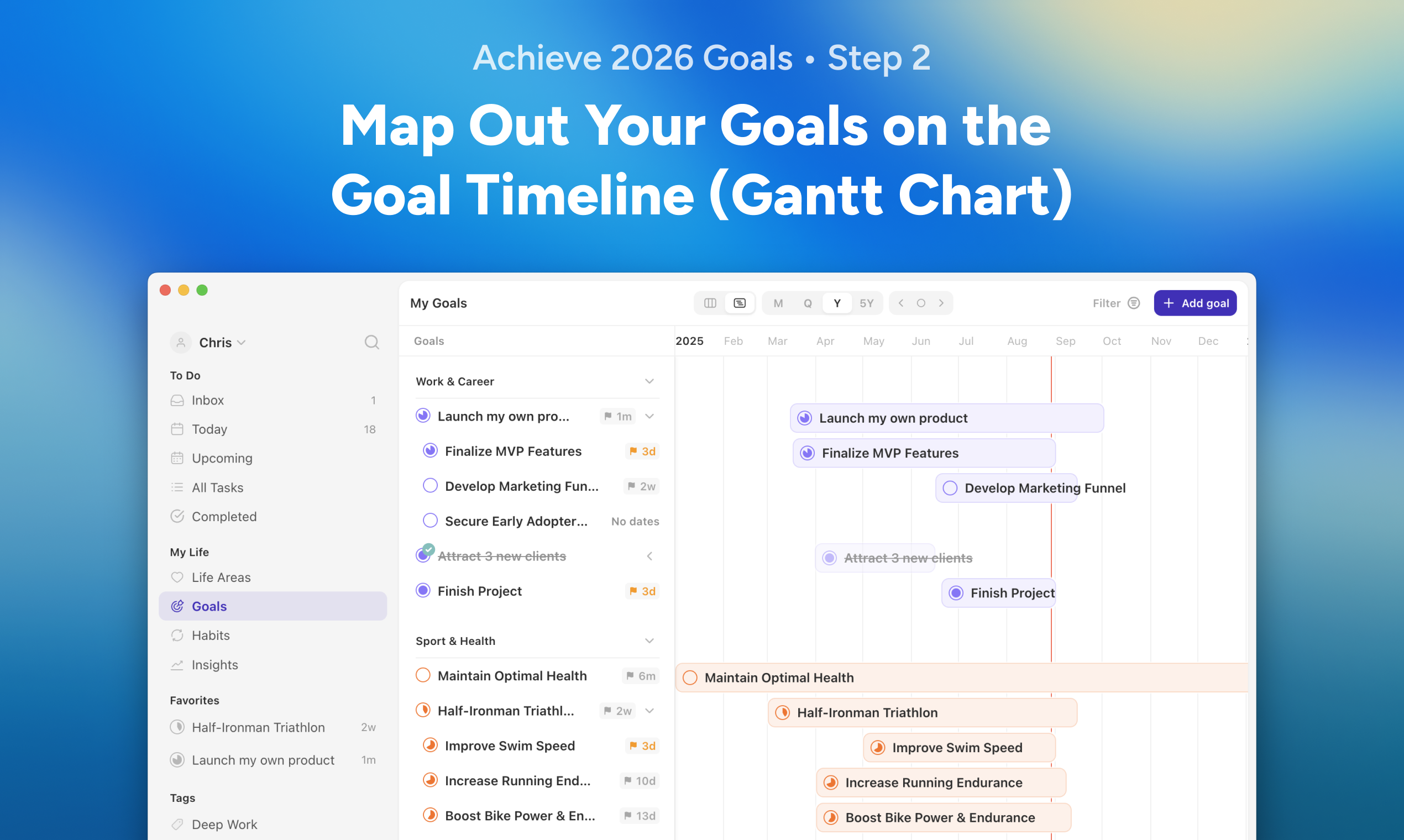 • Plan long-term goals on a goal timeline (Gantt-style view)