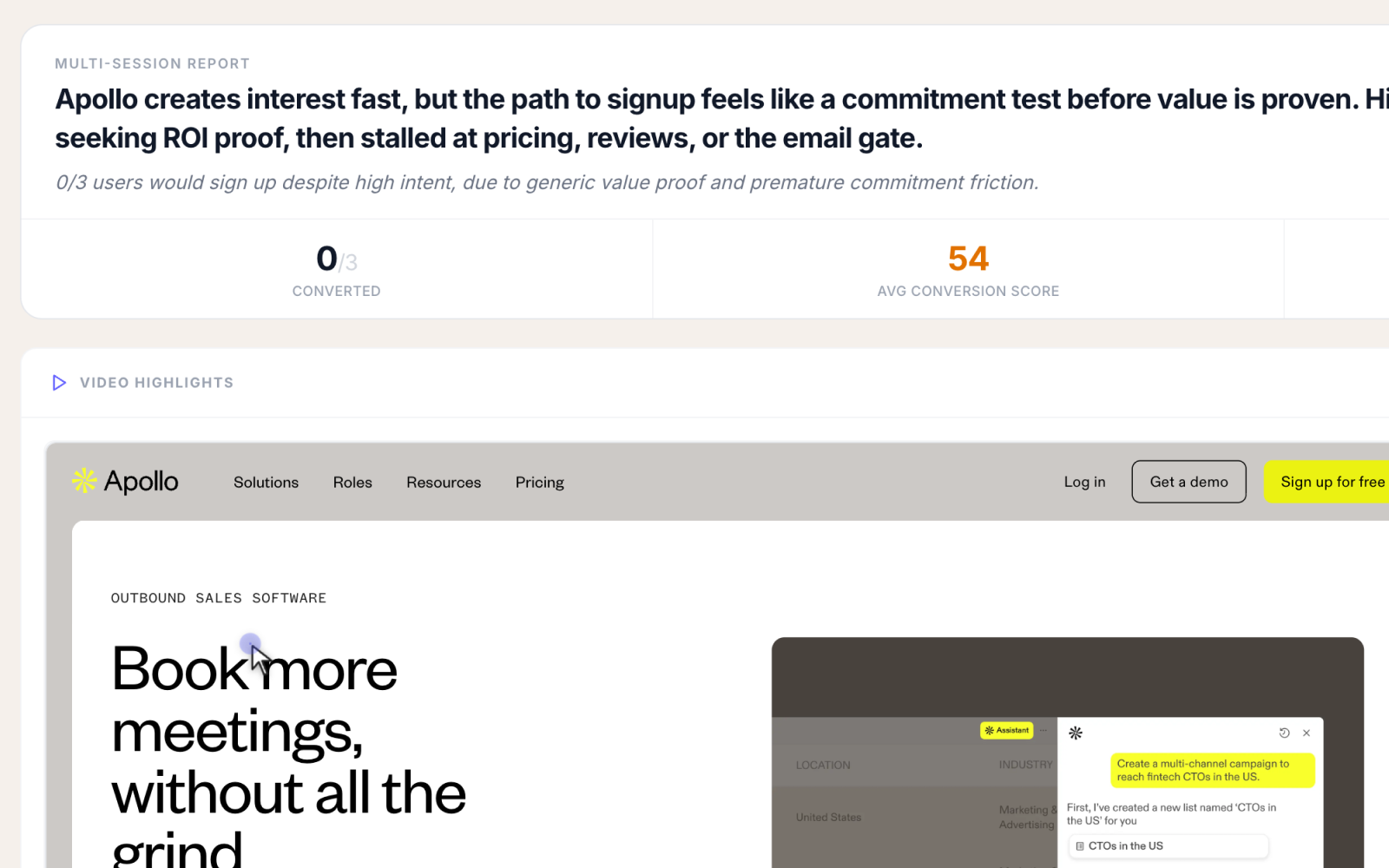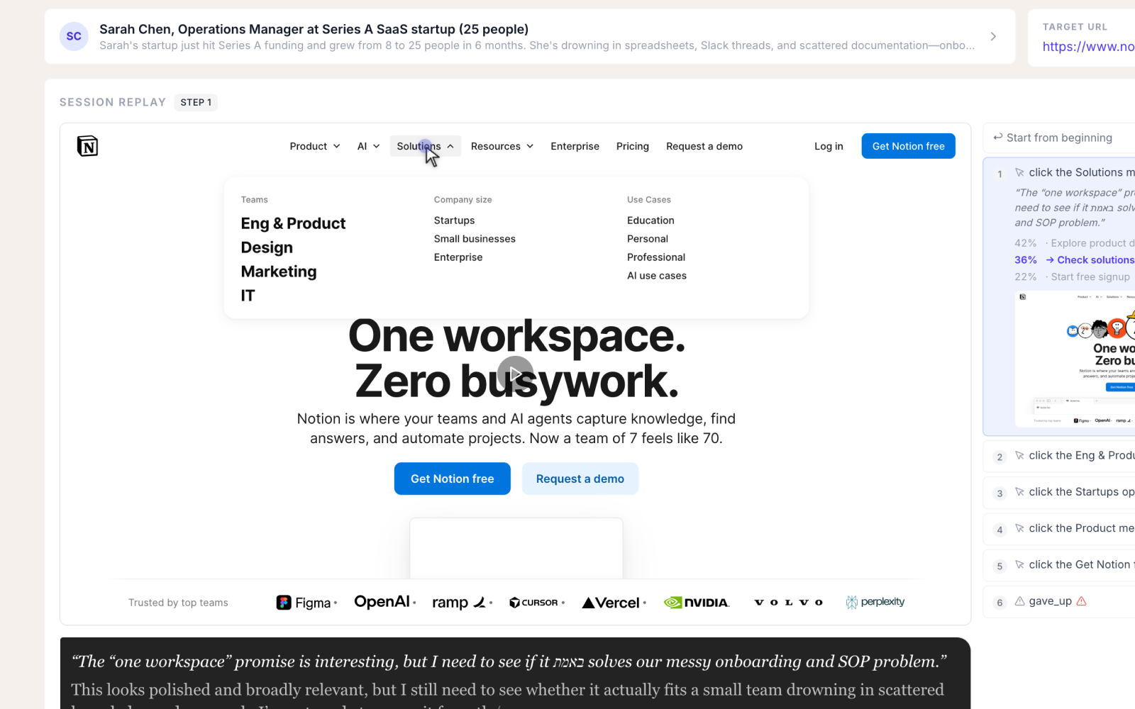模擬初次使用者行為,看看他們為什麼流失。透過這項工具,您可以深入了解使用者在轉換過程中的斷點。