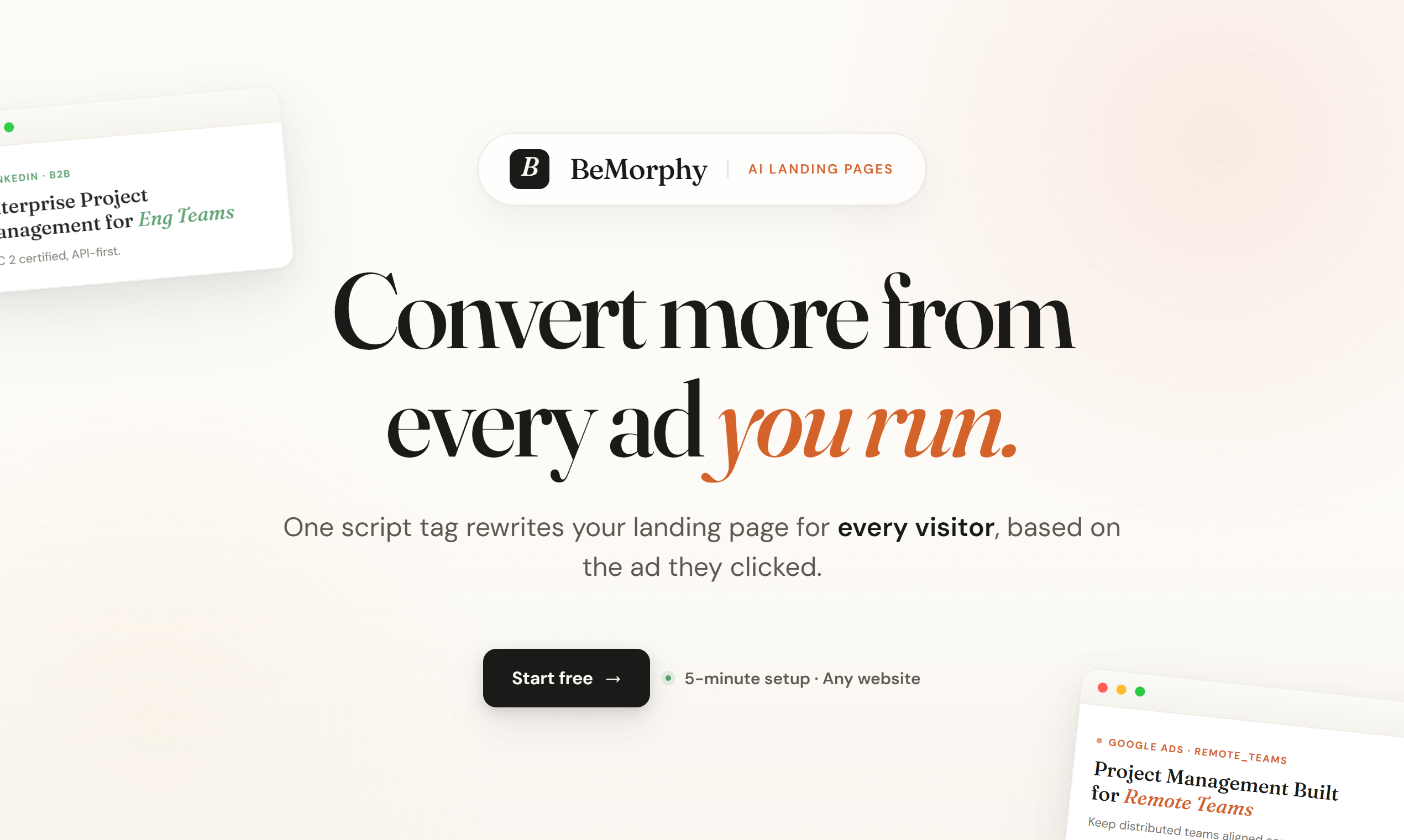 BeMorphy 是一款人工智慧驅動的工具,旨在為你投放的每一則廣告自動重寫並優化登陸頁面,以提升轉化率。