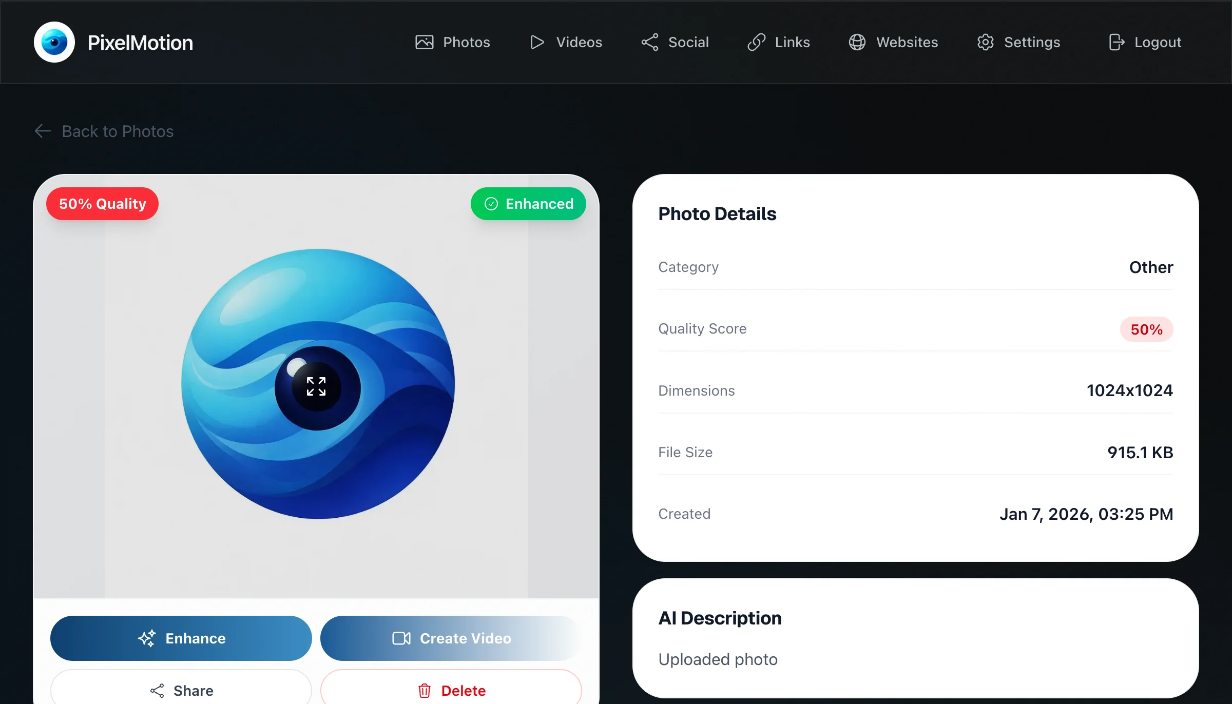 AI quality scoring ensures only the best photos are used, with automatic enhancement for suboptimal images