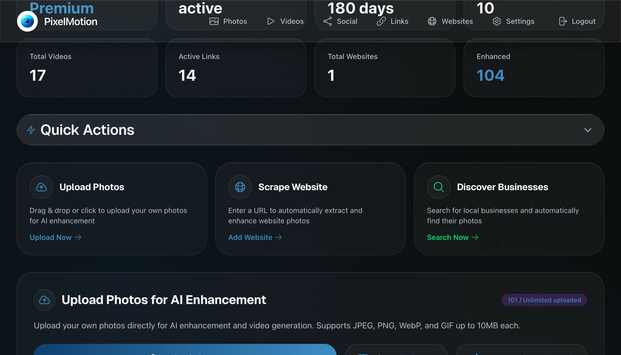 Transform photos into professional marketing videos with AI. Enhance images, generate cinematic content, and post directly to YouTube Shorts & TikTok.