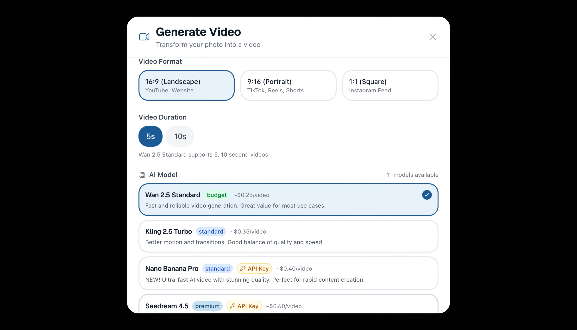 Turn photos into scroll-stopping videos with 11 AI models. Or generate from text prompts alone.