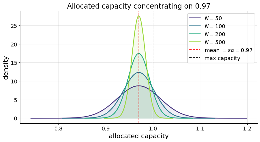 通過執行此策略,被分配工作的身份數量是一個隨機變數 $X \sim \text{Binomial}(N, \varepsilon)$,因此供應商被分配的容量量為 $\alpha/ N \cdot X$。通過取較大的 $N$,供應商可以將其獎勵分佈集中在其均值 $\alpha \varepsilon < 1$ 上,同時使被過度分配的機率變得任意小。這對他們有利,因為他們獲得的獎勵接近 $\alpha \varepsilon \lambda > \varepsilon \lambda$。