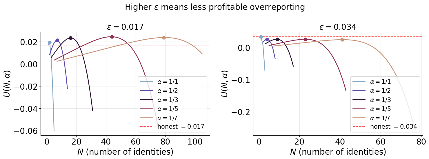 因此,我們只需要檢查滿足上述條件的有限個 $\alpha$ 值。可以證明,當我們固定 $\alpha$ 值時,效用對 $N$ 是單峰的(但我們將略過證明,因為它不那麼有趣)。直觀上,這告訴我們對於每個 $\alpha$,存在一個唯一的最佳 $N$ 值,表示攻擊者將使用的最佳身份數量。因此,我們可以查看 $N$ 和 $\alpha$ 的最佳值是否為 1,以確定對於給定的 $S, \varepsilon$,真實報告是否為最優。