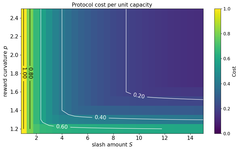 此程序可用於尋找 $\varepsilon^$。在這個單位成本示例中,協議最終支付 $2 \varepsilon^$,因為單位容量真實報告的獎勵函數為 $(1+1^p)\cdot \varepsilon^$。對於非單位容量,協議的成本與 $\varepsilon^$ 成線性關係。下圖顯示了單位容量示例中協議成本作為 $S, p$ 函數的數值計算熱圖。