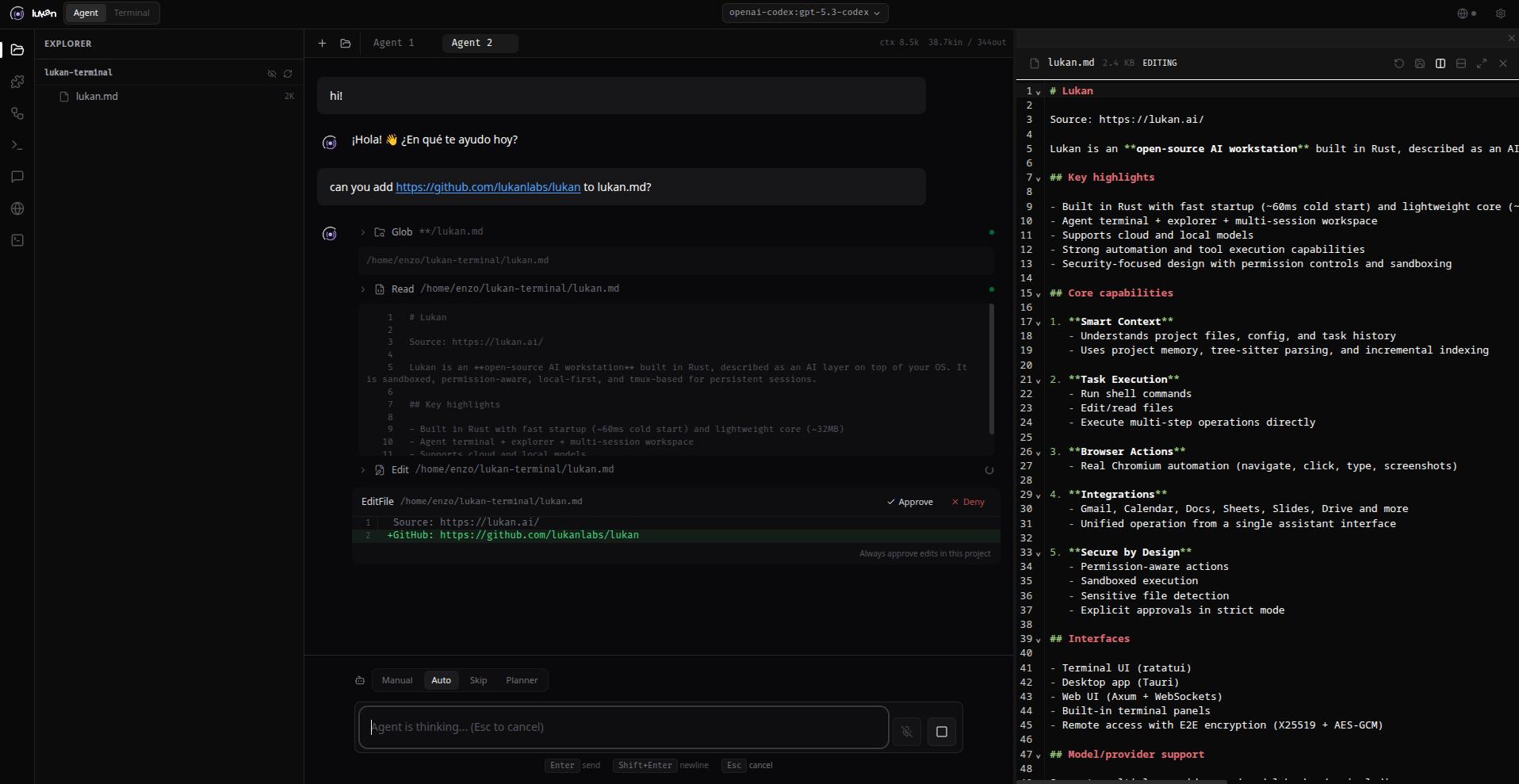 Lukan 是一款開源的 AI 驅動工作站,整合了 AI 代理與 IDE,旨在簡化編程、運維及日常生活任務。