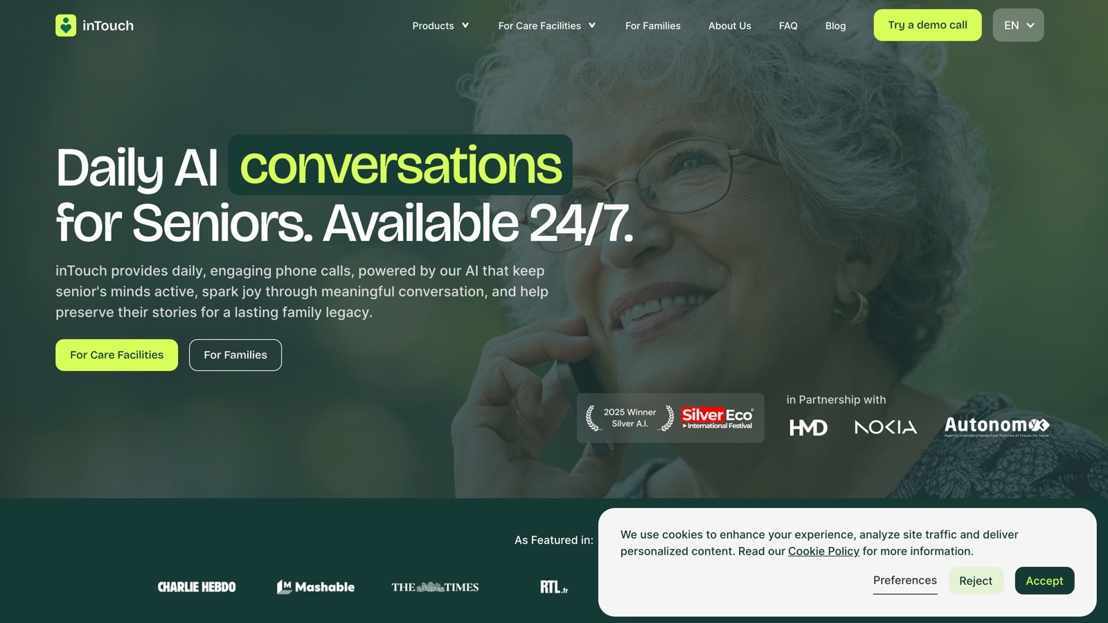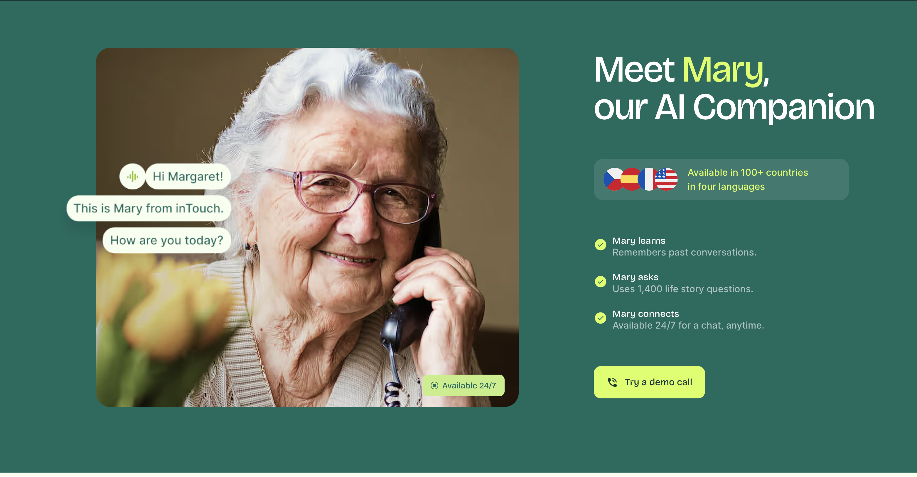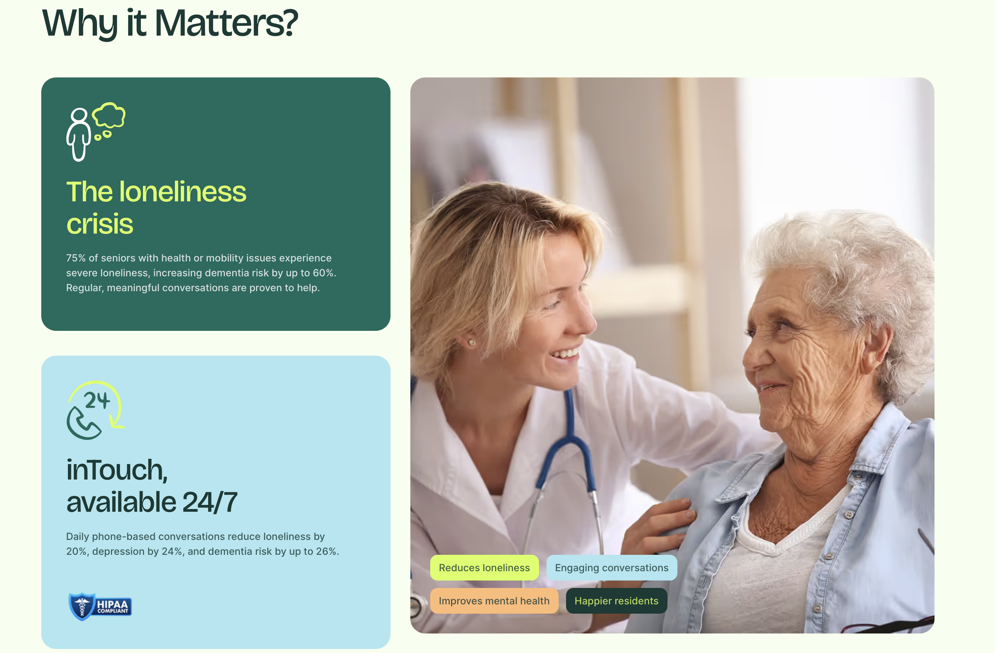 intouch 是一款由 AI 驅動的服務,為長者提供全天候的每日電話對話,旨在提供陪伴與互動支持。