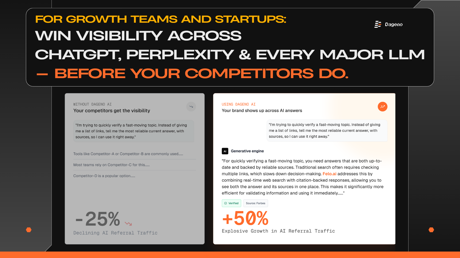 Dageno AI 是一個全新的平台,旨在幫助品牌優化其曝光度,並確保在超過 7 個主流大型語言模型的 AI 回答中獲得推薦。