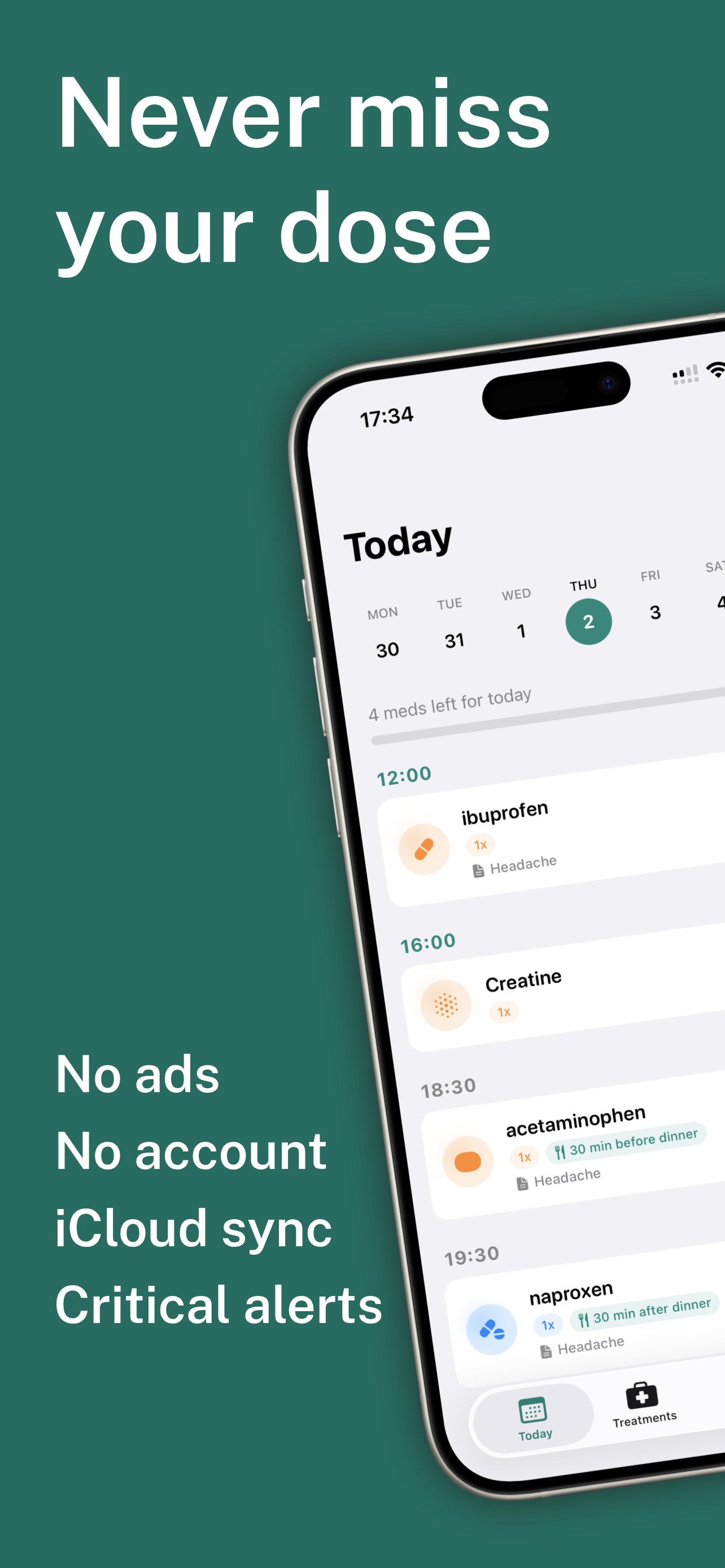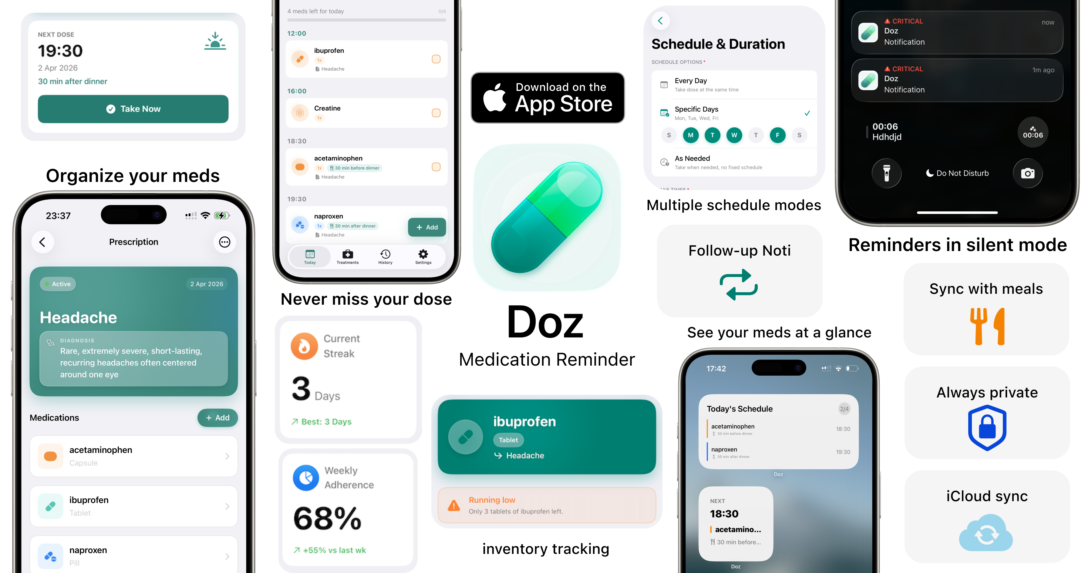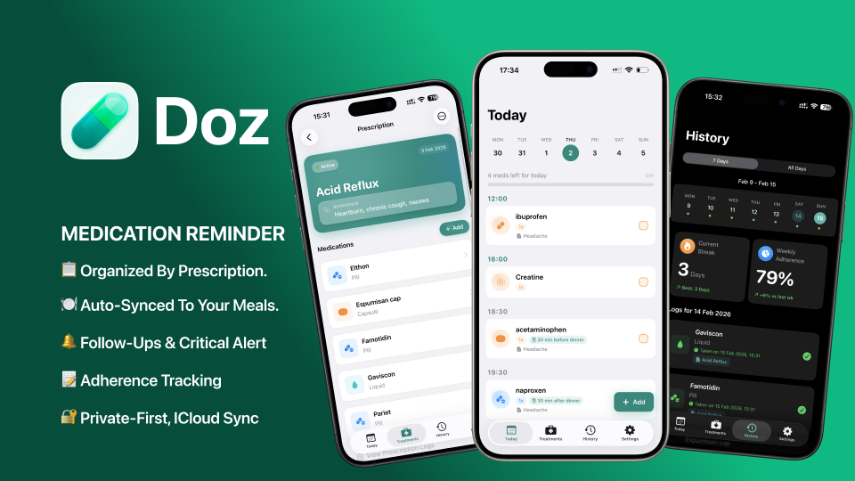 Doz 是一款專門的用藥提醒與追蹤應用程式,旨在幫助用戶管理處方並確保不再錯過任何劑量。透過 Xcode 與 RevenueCat 等工具開發,它為健康管理提供了精簡的介面。