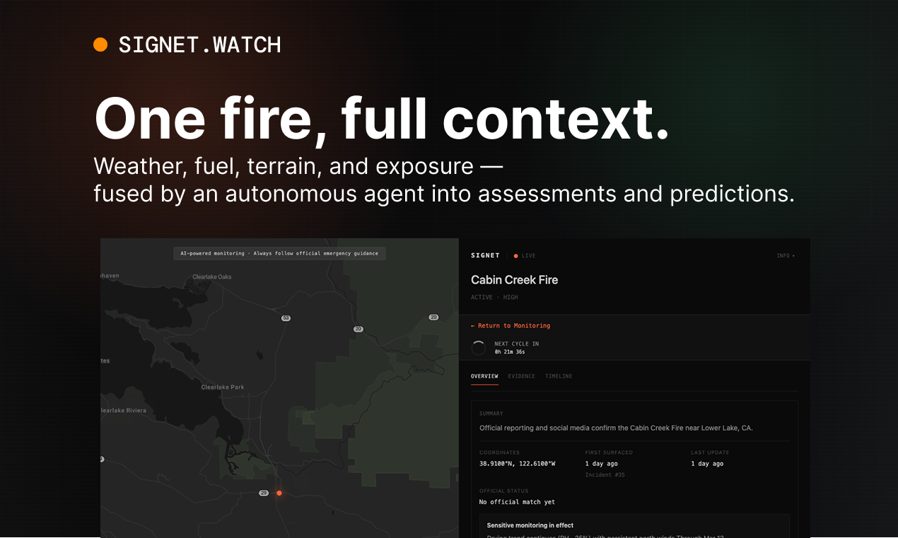 Signet 是一款自主 AI 野火代理,能針對鄰近地區提供即時警報。這是一個具備鄰近警報功能的自主 AI 野火監測代理。